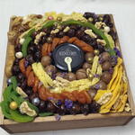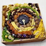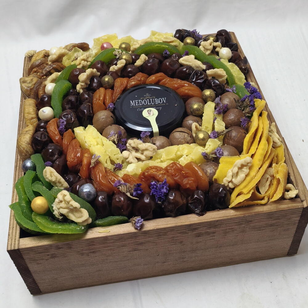 Композиция из сухофруктов и орехов с мёдом, украшенная цветами фиолетовой статицы в квадратном деревянном ящике