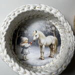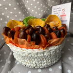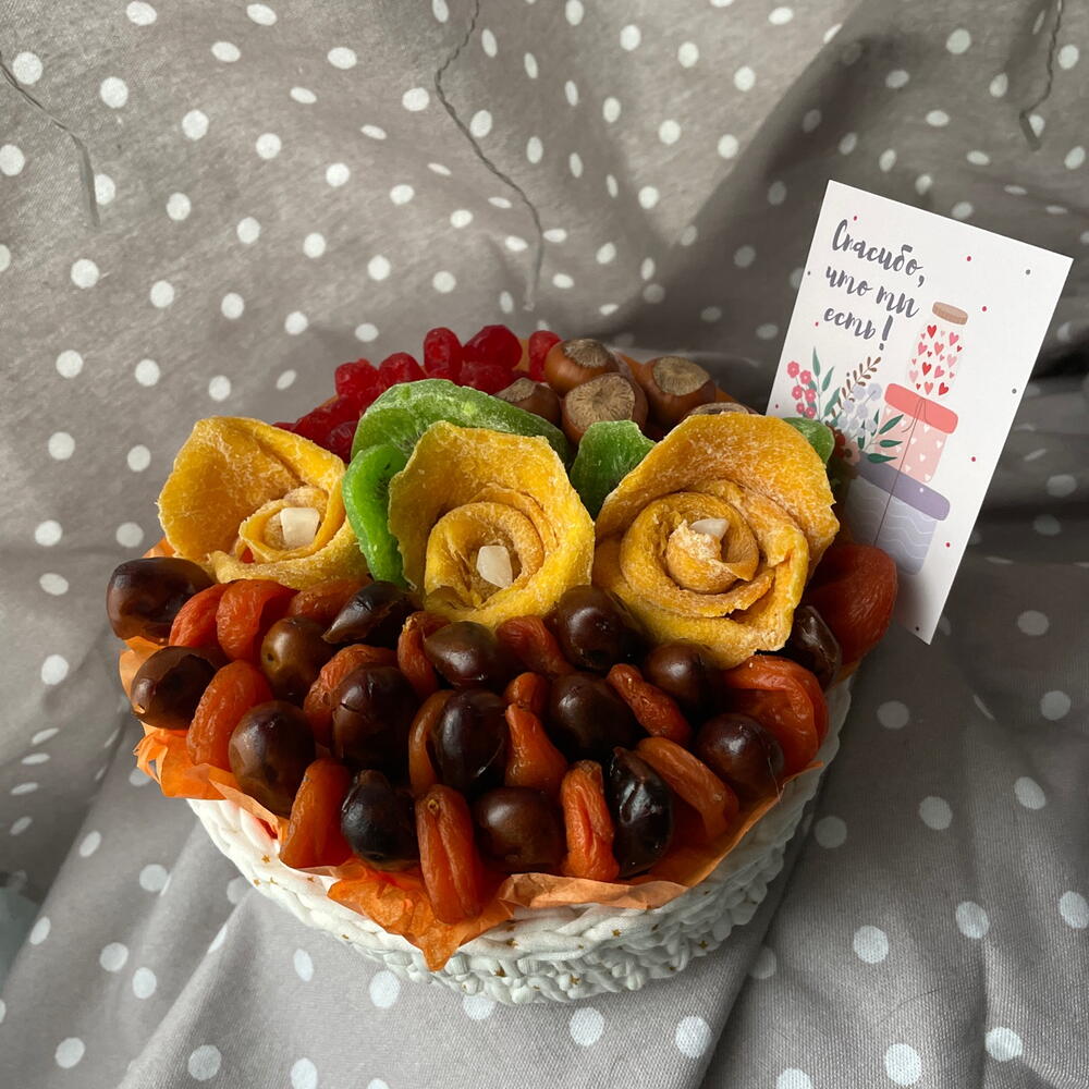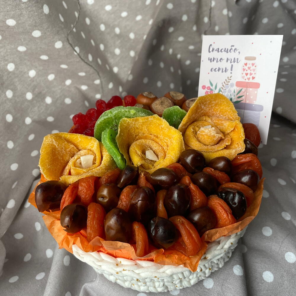 Корзина с деревянным цветным донышком, связанная вручную. Наполнена сухофруктами. В единственном экземпляре