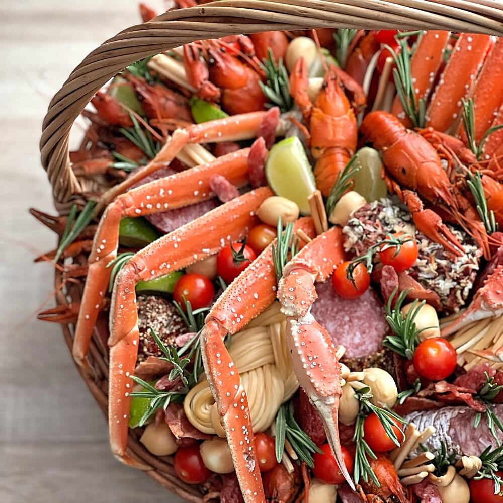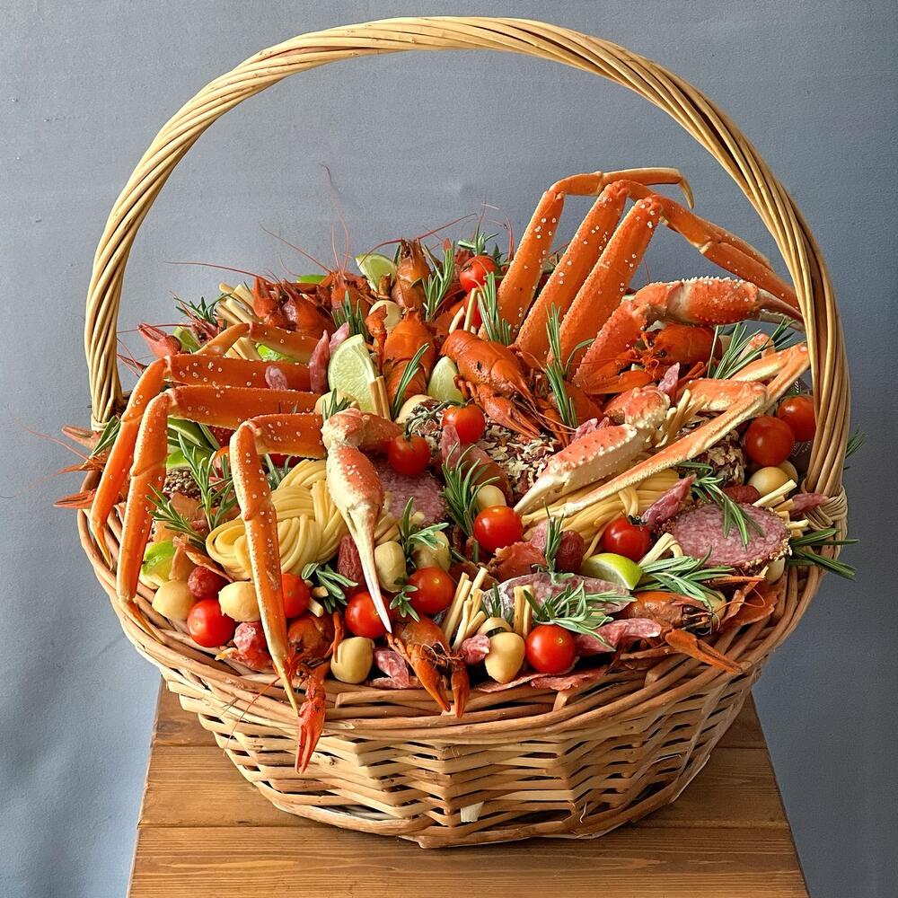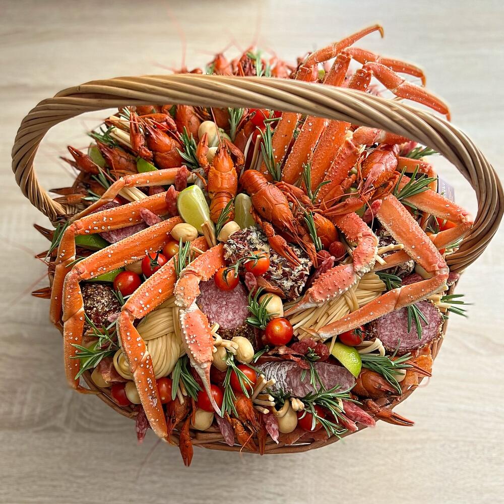 Вкусная, ароматная корзина с деликатесами. Все продукты закупаются индивидуально под каждый заказ. Ингредиенты все премиум сегмента, вкусные, свежие. Морепродукты в букете отварные, собираем пока они горячие. Доставка точно ко времени, вежливым, аккуратным и пунктуальным курьером. Хотите удивить? Чтоб запомнилось надолго и было собрано качественно ? Тогда Вы в нудном месте 💯 Все съедобные композиции упакованы в прозрачную плёнку. Все санитарные нормы при сборке соблюдены.