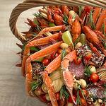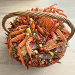 Лайм - 3 шт. Корзина плетеная - 1 шт. Розмарин - 1 шт. Оазис флористический - 3 шт. Колбаса сырокопченая - 5 шт. Сыр косичка - 1 шт. Сыр копченый - 1 шт. пивчики - 1 шт. сыр с белой плесенью - 1 шт. клешни краба - 3 шт. черри помидоры - 1 шт. раки вареные - 26 шт. открытка с вашими пожеланиями - 1 шт. зубочистки упаковка - 3 шт.