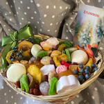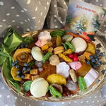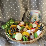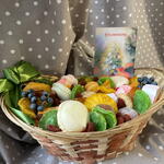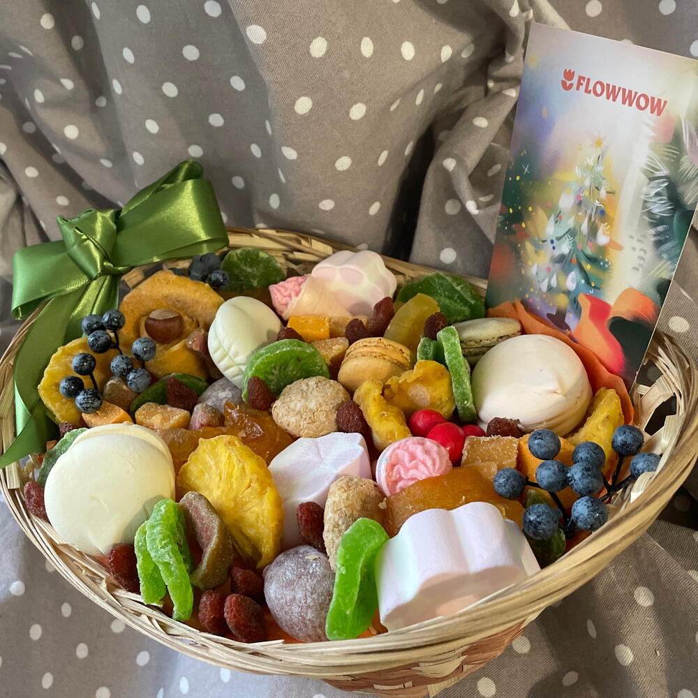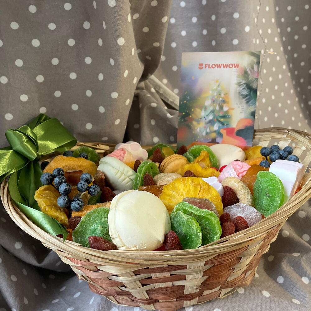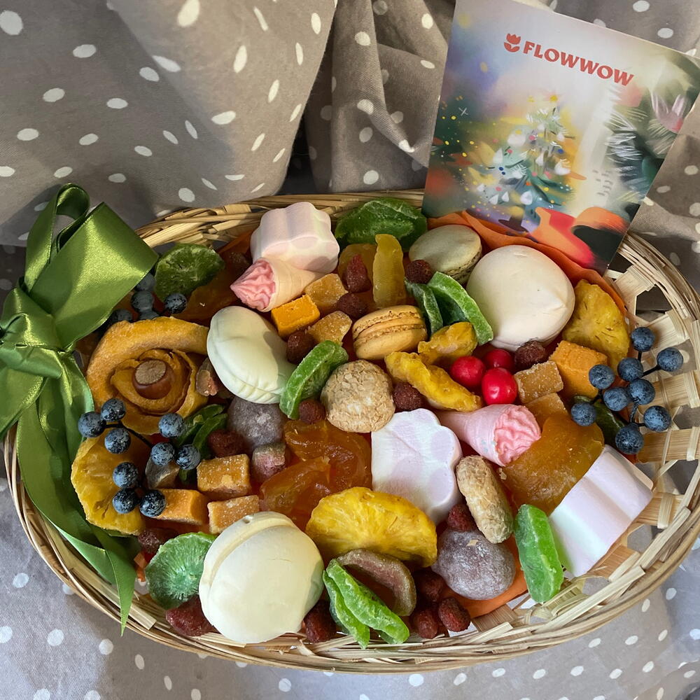 Макарон - 2 шт. Ананас сушеный - 5 шт. Манго сушеный - 3 шт. декоративный элемент ягоды - 3 шт. гуава сушеная - 5 шт. киви цукаты - 12 шт. манго конфеты - 9 шт. маршмеллоу лапки - 3 шт. печенье банановое - 2 шт. клубника сушеная цукат - 15 шт. зефир тропический - 3 шт. дыня канталупа цукат - 4 шт. жевательный мармелад мороженое - 2 шт. моти клубничный - 2 шт.