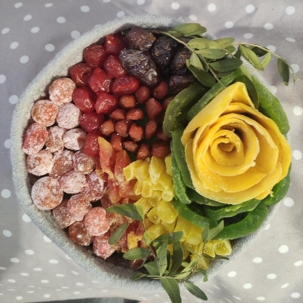 Манго сушеный - 150 гр. кумкват в сахарной пудре - 50 гр. финики королевские - 2 шт. фисташка сухоцвет - 2 шт. клубника вяленая цукат - 10 шт. киви сушеный цукат - 50 гр. дыня сушеная цукат - 50 гр. вишня сушеная цукат - 10 шт.