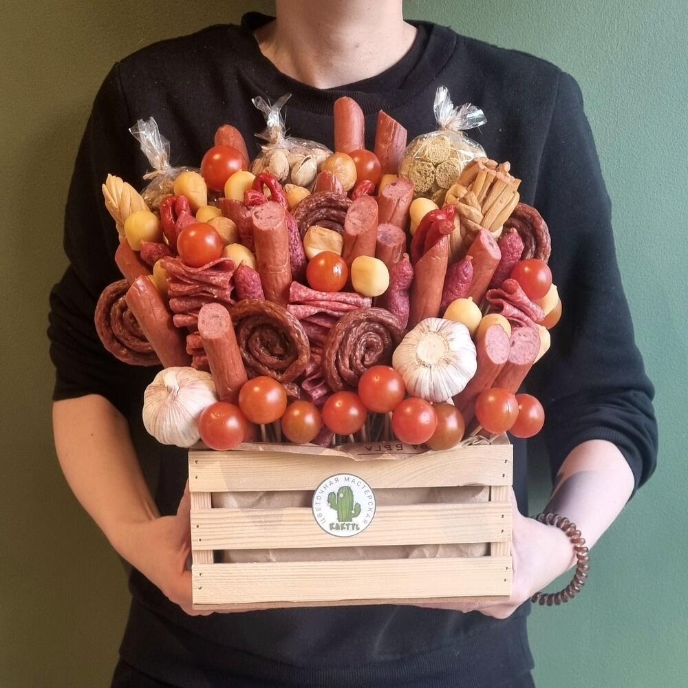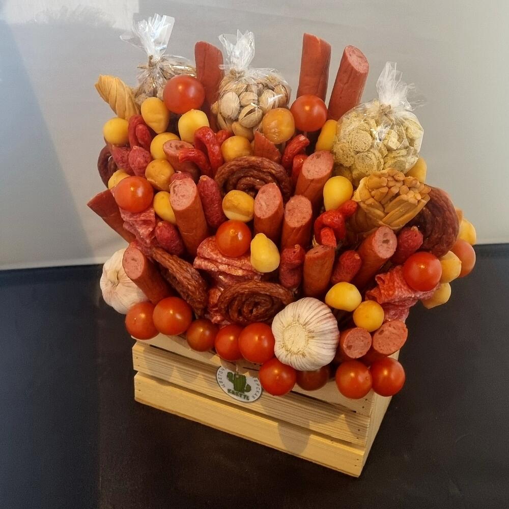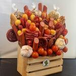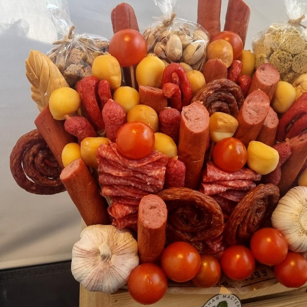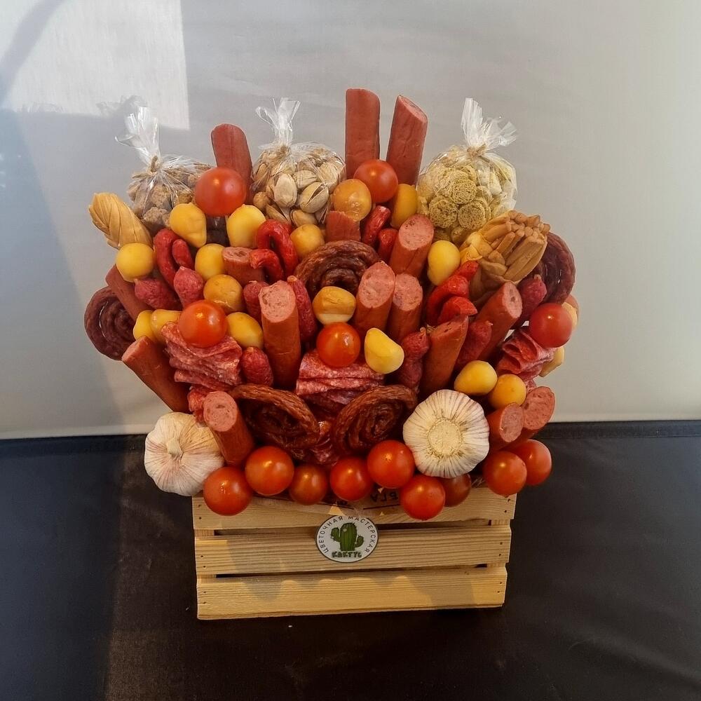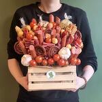 Томаты черри - 1 шт. Колбаса сырокопченая - 1 шт. Сыр косичка - 1 шт. Колбаски охотничьи - 1 шт. чеснок натуральный - 2 шт. колбаса сервелат - 1 шт. сухарики кулек - 2 шт. колбаса пиколини - 1 шт. фисташка кулек - 1 шт. сыр бокончини - 1 шт. колбаса смаки - 1 шт.