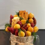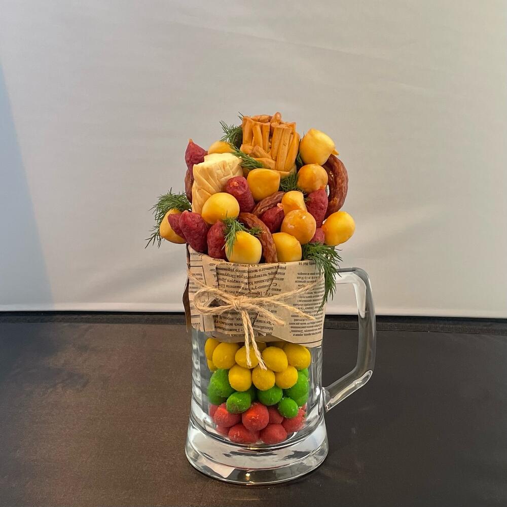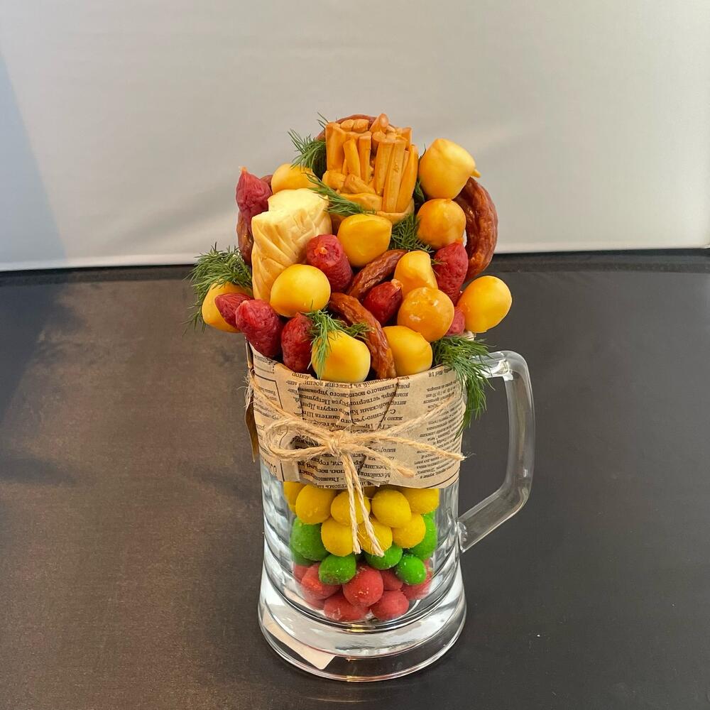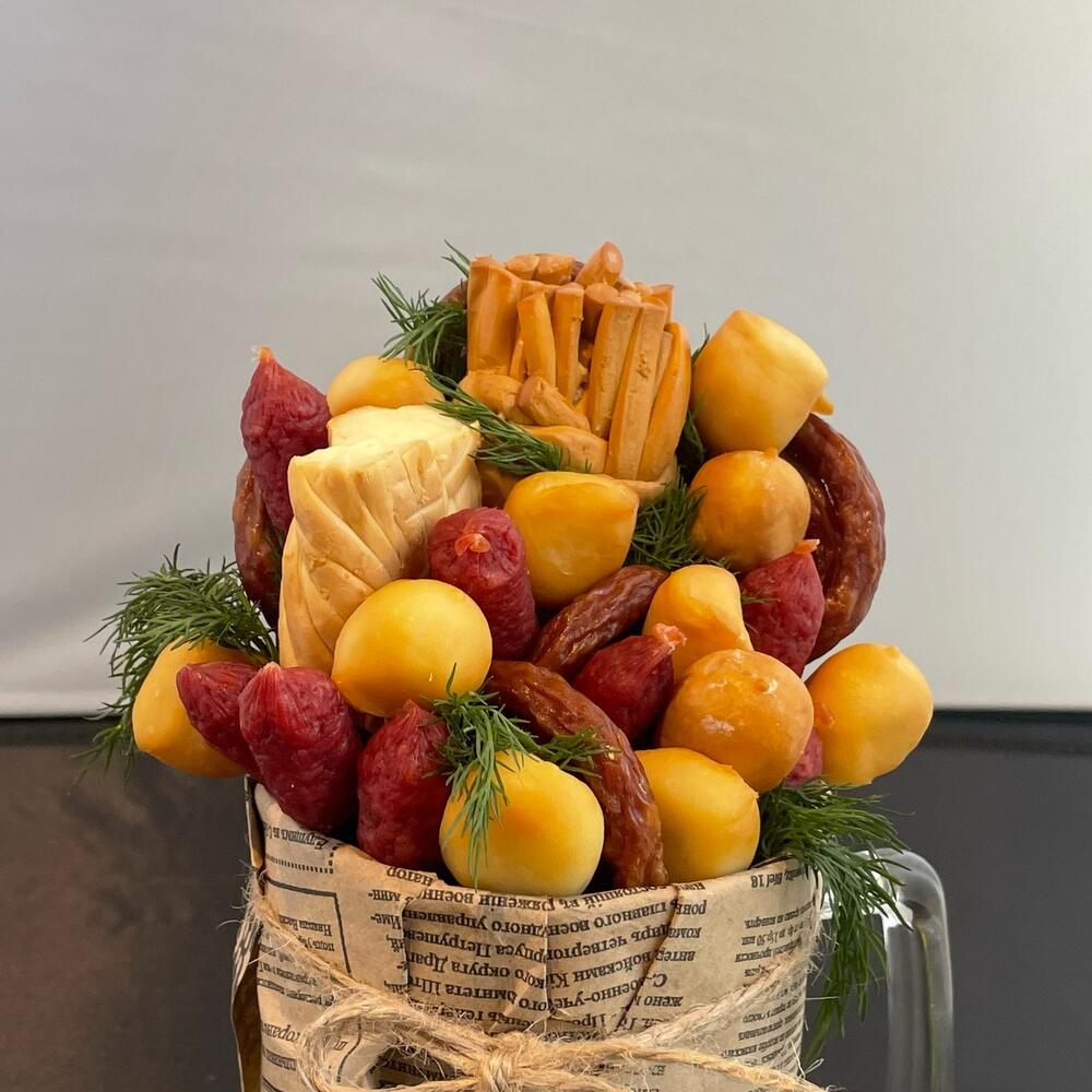 Зелень - 1 шт. Сыр косичка - 1 шт. Бокал из стекла - 1 шт. сырокопченые колбаски - 1 шт. сыр боккачини - 1 шт. арахис ассорти - 200 гр. мясные колбаски - 1 шт.