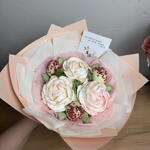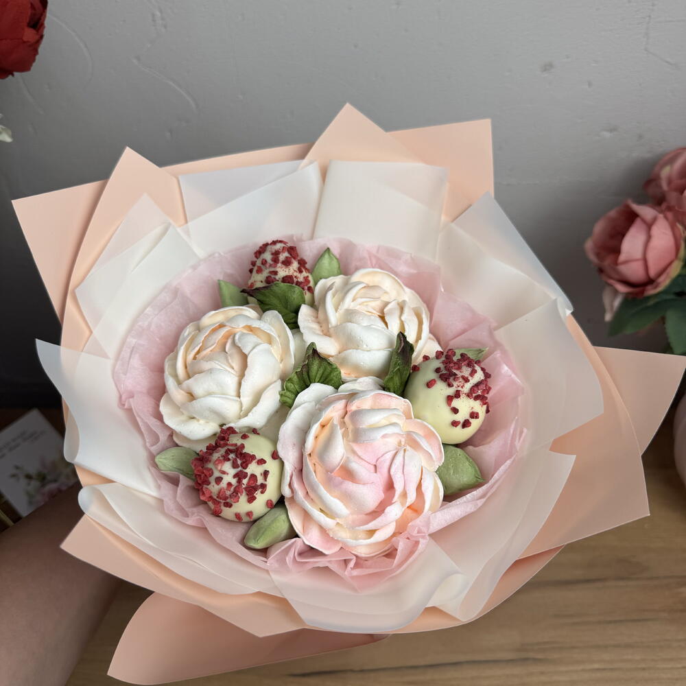 💐 Зефирный букет «Пионы с клубникой в белом шоколаде» 💐 Нежный и утончённый подарок, в котором красота сочетается с вкусом и пользой. Букет создан вручную из зефира на натуральном абрикосовом пюре 🍑 и дополнен изысканными ягодами клубники в белом шоколаде 🍓🤍. Каждый бутон выполнен с любовью и вниманием к деталям — выглядит как живой цветок и источает лёгкий аромат фруктовой сладости. ✨ Особенности: - 100% натуральный состав — без ароматизаторов, красителей и патоки - Зефир богат белком (свыше 30%) и клетчаткой - Умеренная, «понятная» сладость, подходящая даже тем, кто не любит приторные десерты - Устойчивая ножка — букету не нужна ваза - Не требует холодильника и удобно транспортируется 🎁 Прекрасный подарок для мамы, подруги, коллеги или учителя. Подойдёт на любой праздник: День матери, 8 марта, день рождения или просто от души. Каждый букет — маленькое съедобное произведение искусства, созданное с теплом и душой. 🌷