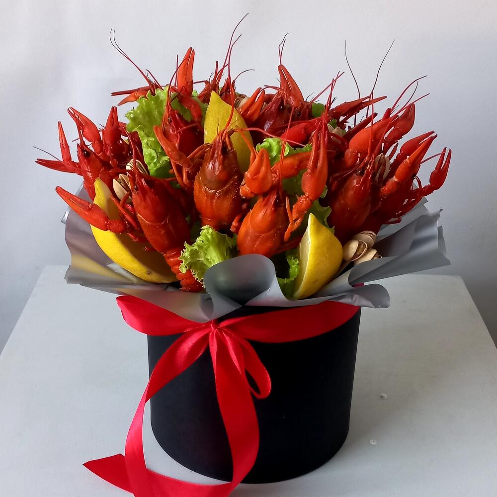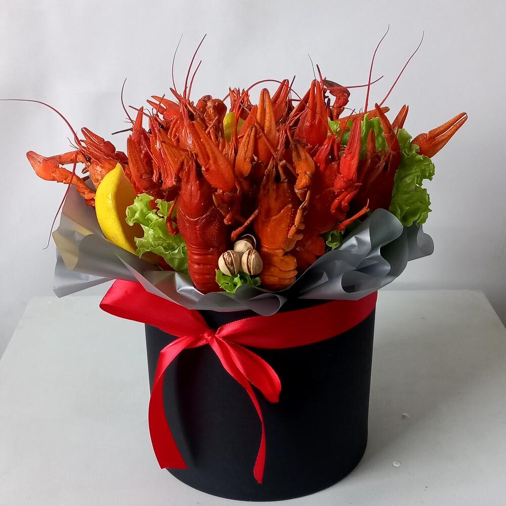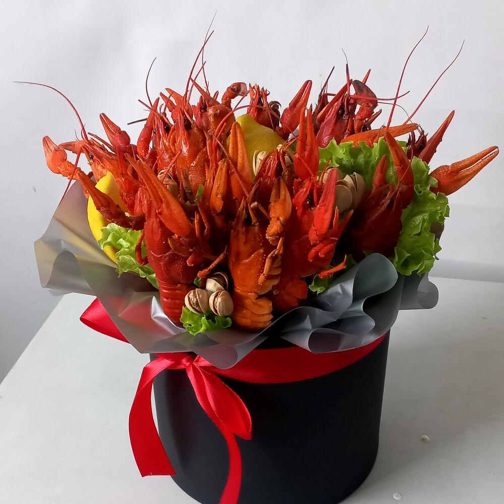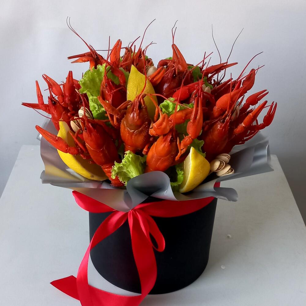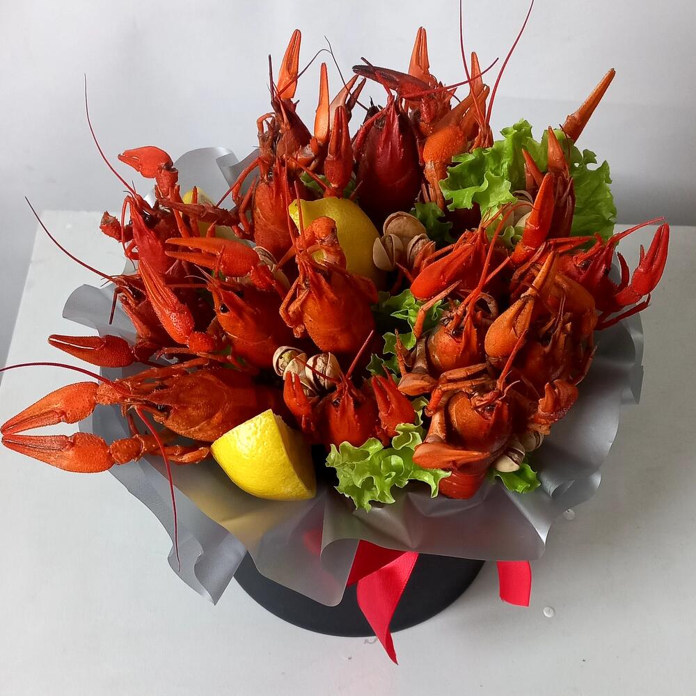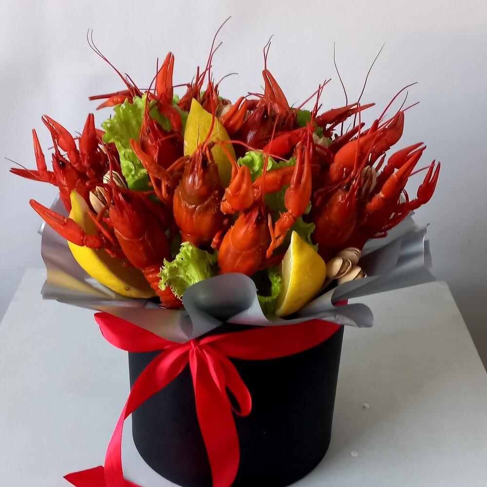 Зелень - 1 шт. Коробка - 1 шт. Лимон - 1 шт. Шпажки - 23 шт. Фисташки - 9 шт. раки вареные 20-40г - 19 шт.