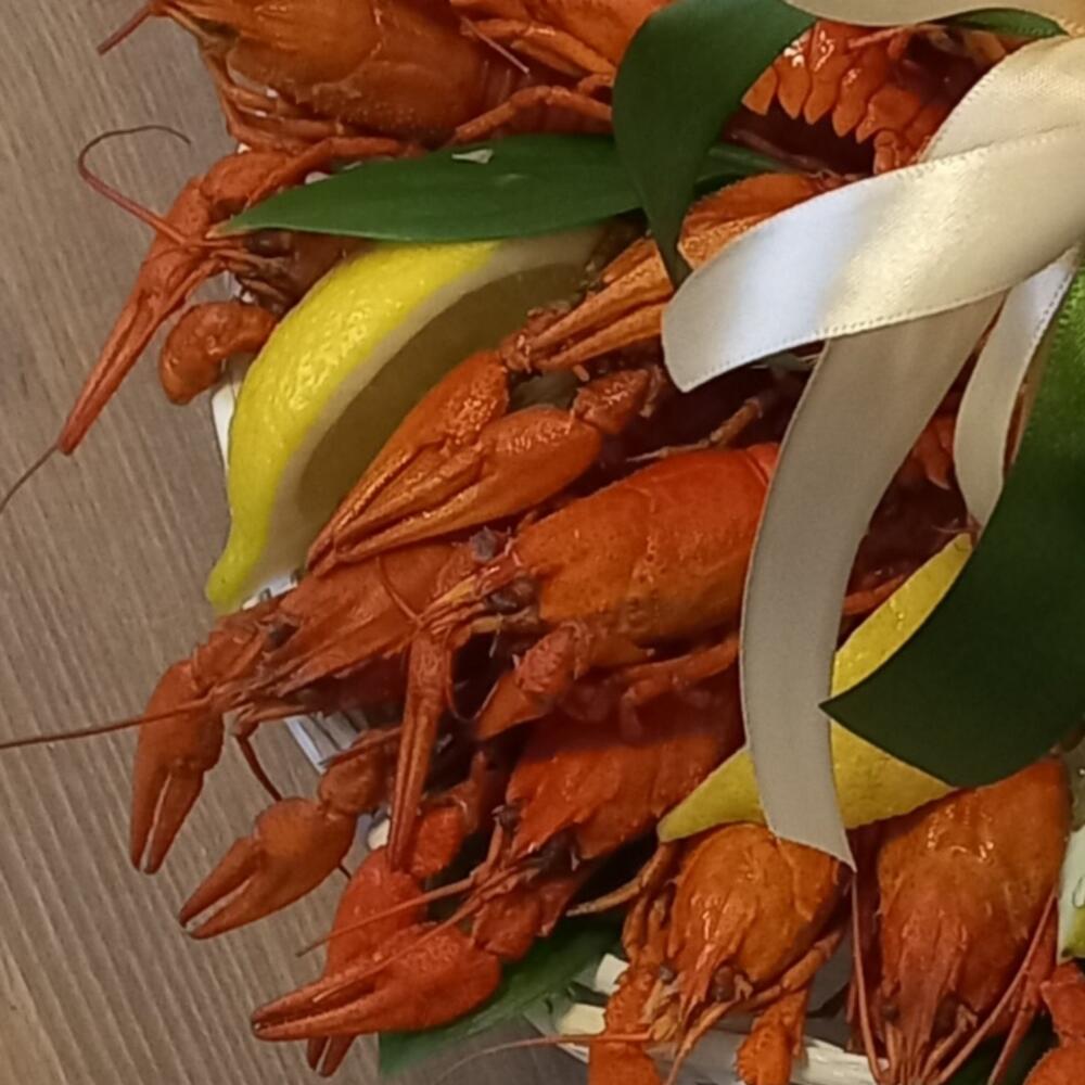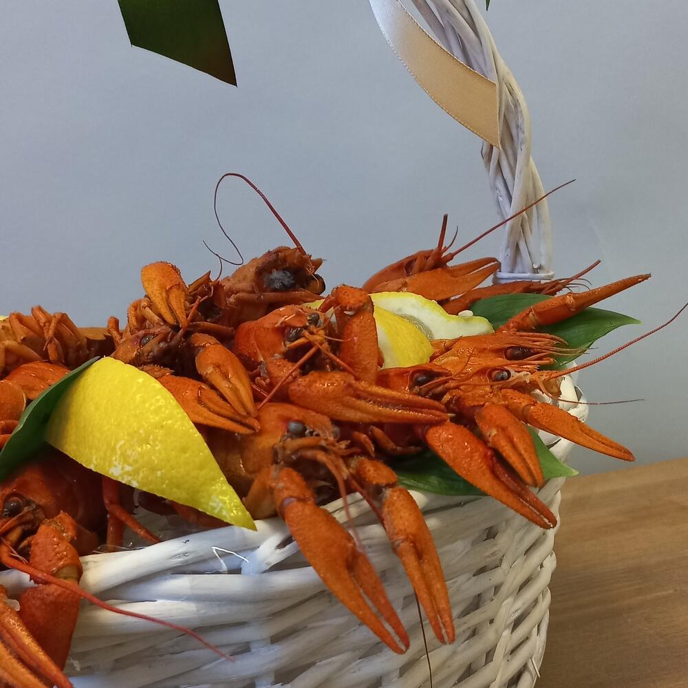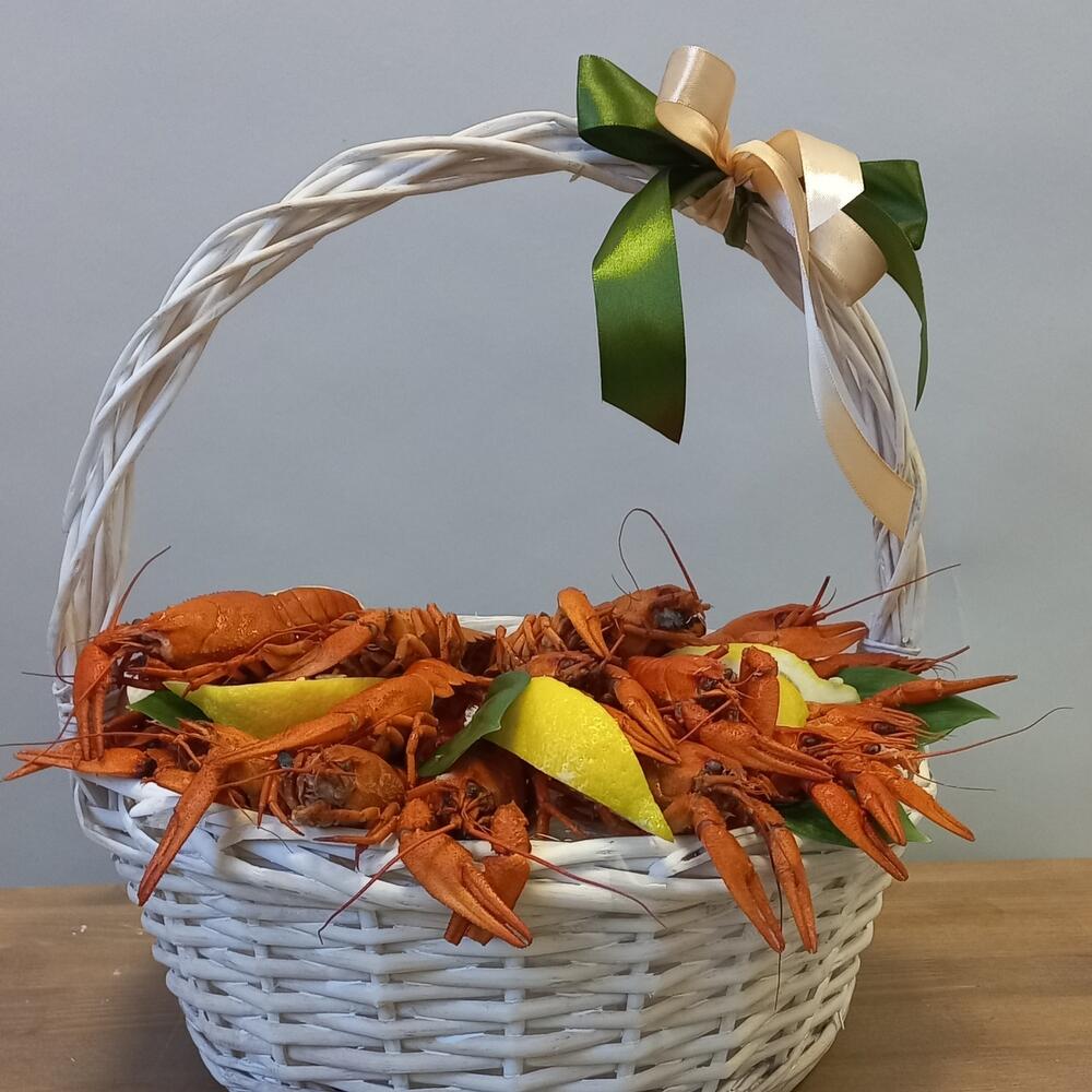 Корзина - 1 шт. Лимон - 1 шт. Оазис флористический - 1 шт. шпажки деревянные упаковка - 1 шт. раки вареные - 25 шт.