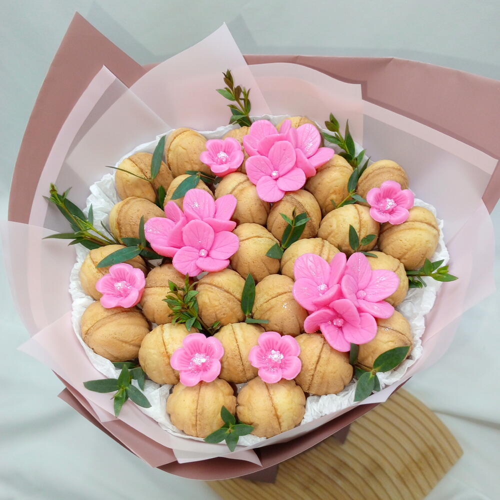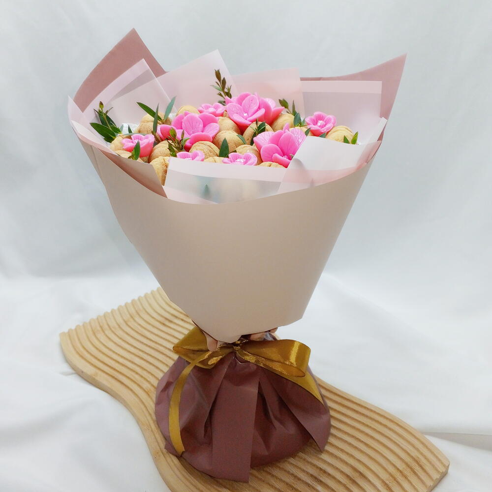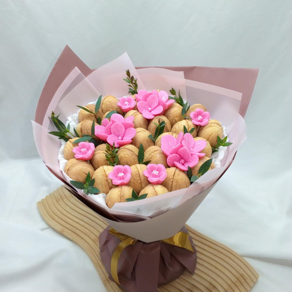 зелень эвкалипт пучок - 1 шт. орешки с вареной сгущенкой ручной работы - 27 шт. цветы из молочного мармелада - 8 шт.