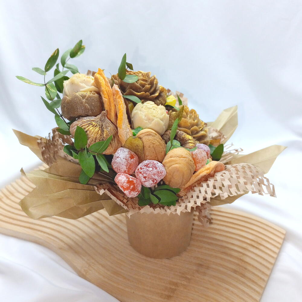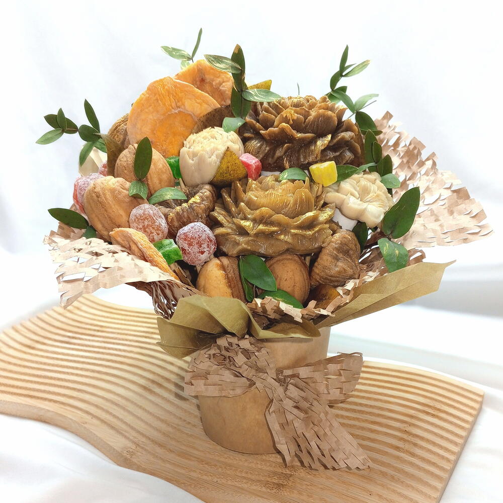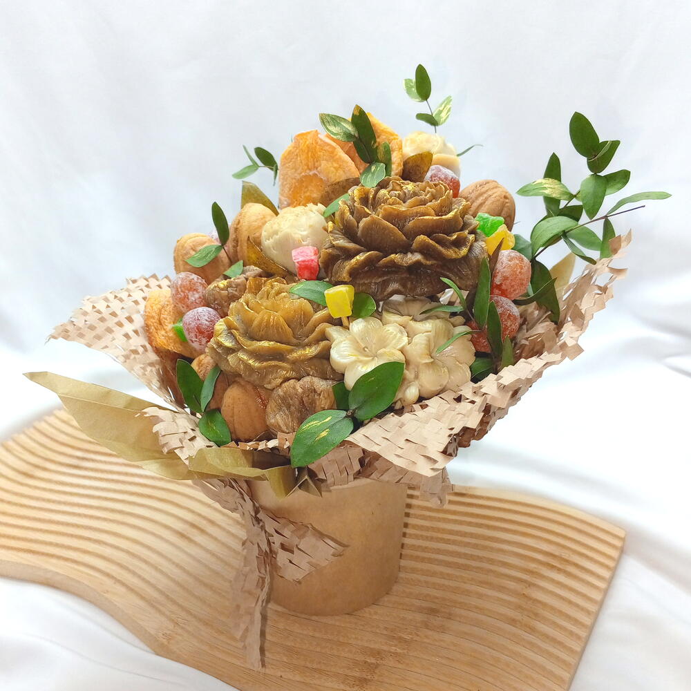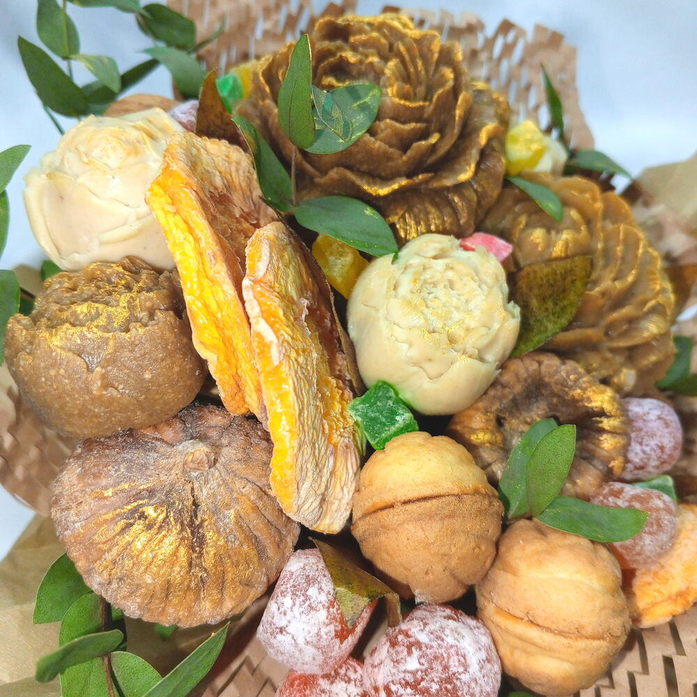 кумкват в сахарной пудре - 10 шт. зелень эвкалипта пучок - 1 шт. вяленый инжир - 3 шт. цукаты ананаса ассорти - 10 шт. орешки с вареной сгущенкой - 5 шт. цветы из халвы с семенами подсолнуха - 2 шт. цветы из десертной халвы - 3 шт. цветы из мармелада молочная халва - 2 шт. вяленый персик ломтики - 3 шт.