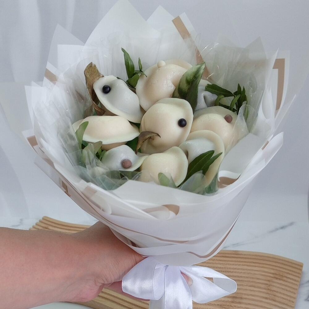 Небольшой букетик из шоколадных конфет в виде пельмешек🙂 Отличный небольшой презент, комплимент, дополнение к подарку для мужчин🔥 Только по предзаказу! Упаковку можно поменять на другой желаемый цвет, пишите в комментариях при оформлении заказа🌹 Расположение и зелень могут незначительно отличаться.
