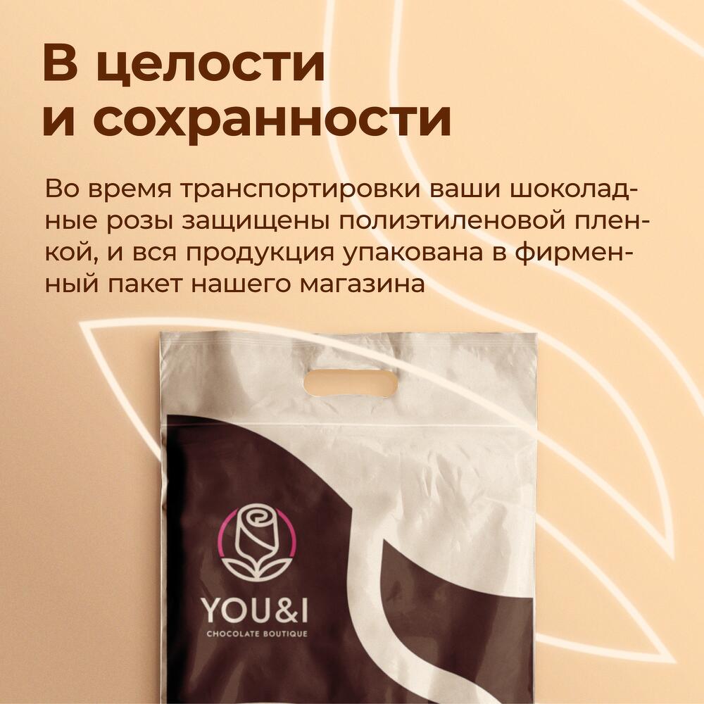 Шоколадные розы компании You&i выполнены из 100% Бельгийского шоколада. Шоколадный букет- это отличный способ порадовать подругу, девушку, жену, маму и бабушку. Шоколадные цветы- это отличная альтернатива живым цветам, а также оригинальный подарком, как на день рождения, так и на свадьбу. Компания You&i располагает собственным производством и весь товар сертифицирован! Оттенок цветов в наличие может незначительно отличаться от представленных на фото. Букет убирать в холодильник не нужно! Букет необходимо хранить при комнатной температуре. Букет не рекомендуется держать вблизи нагревательных приборов и под длительным воздействием солнечных лучей. Для защиты от внешних воздействий букеты дополнительно упакованы в прозрачную плёнку и фирменный пакет.