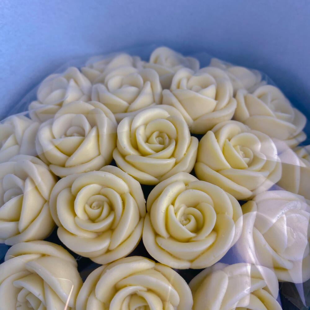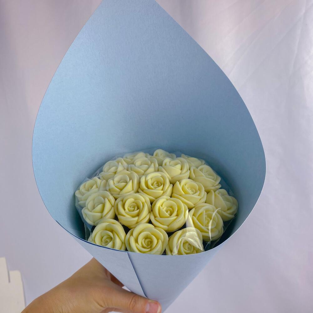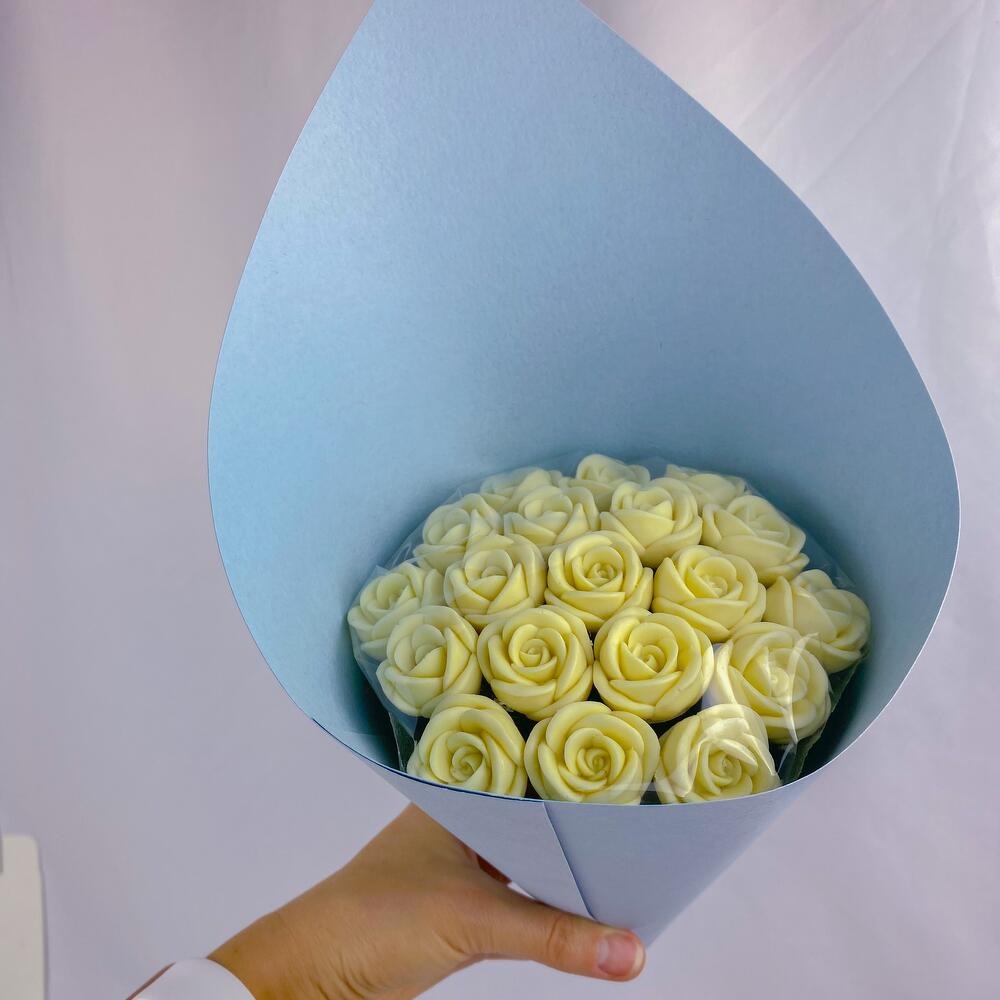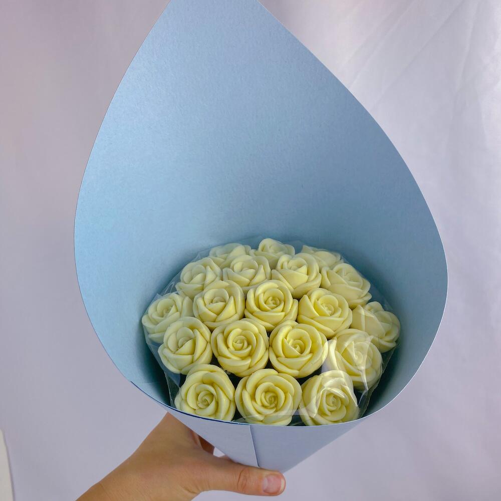 Шоколадный букет из 19 шоколадных роз белого цвета в голубой упаковке! Больше шоколадных букетов смотрите в профиле! - собственное производство в Москве! - изготавливаем шоколадные розы в день доставки - только бельгийский шоколад Callebaut Положим открытку в подарок! Наши шоколадные розы: - без сои - без глазури - без усилителей вкуса Наши розы не завянут, не засохнут, простоят долго и в качестве приятного бонуса их можно съесть! Важно! Цвет букета вживую может немного отличаться от цвета букета на фото. Удивите того, кто важен нашими букетами!