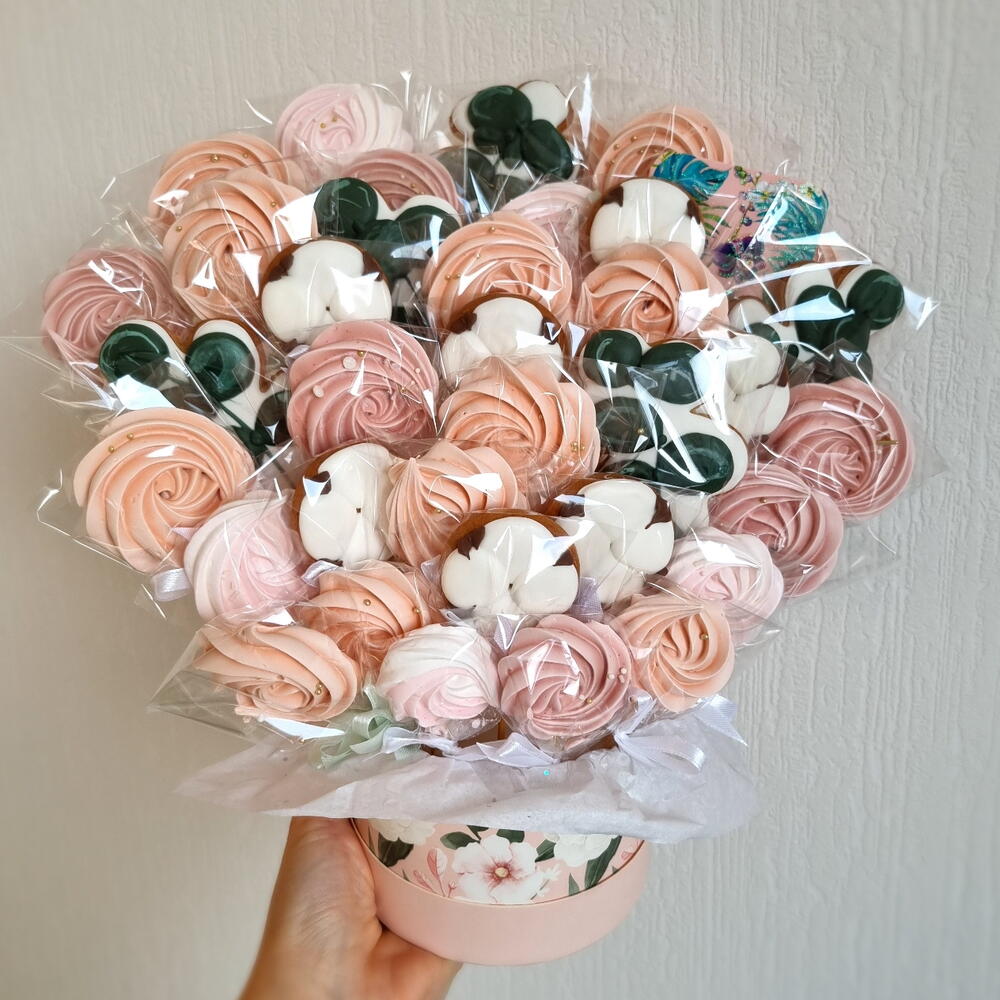 Съедобный букет в шляпной коробке из швейцарской меренги (безе) и имбирных пряников расписанных в виде листьев эвкалипта и цветов хлопка. В композиции: 23 шт безе 5 шт пряники в стиле эвкалипт 7 шт пряники в стиле хлопок ПРЕИМУЩЕСТВА пряничных композиций! 1. СРОК ХРАНЕНИЯ 2 месяца! Это удобно! Может долго радовать глаз, пока классические букеты из настоящих цветов уже покинули вас 2. НЕ ЗАВЯНУТ! Представьте, на утро купленный накануне букет может иметь уже не совсем бодрый вид! Но это не про прянично - безейные букеты, а значит вы подарите ПРЕЗЕНТАБЕЛЬНУЮ☝️ композицию! 3. С ЭТИМ ЕЩЕ И ЧАЙ ПОПИТЬ МОЖНО?! Конечно👌, букеты и композиции собраны из ароматных и мягких тематических ПРЯНИЧКОВ и нежного рыхлого БЕЗЕ (КУСАБЕЛЬНОГО)! И всеми этими вкусняшками можно лакомиться и растягивать удовольствие! 4. ТРАНСПОРТИРОВКА Композиции доедут даже в другой город, а благодаря тому, как композиция упакована, им не страшны капли дождя! 5. ОРИГИНАЛЬНОСТЬ и ПОДАЧА! Сколько букетов цветов подарят человеку на тот или иной праздник?! Согласитесь большая часть! Ваш запомнится надолго и первые 3 преимущества тому доказательство