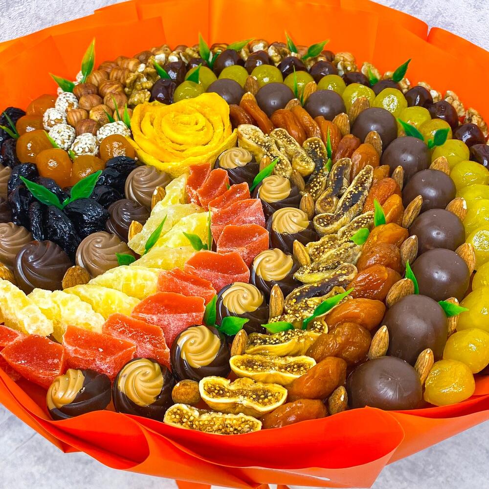Ассорти сухофруктов , орехов с дополнением конфет. Когда не можешь определиться какой делать букет сладкий или сухофруктовый. Можно объединить👌. Если сроки исполнения заказа Вас не устраивает и нужно выполнить заказ раньше- напишите в личные сообщения и спросите о возможности сдвинуть сроки и на сколько. Если мало заказов на этот день, то это будет возможно.