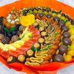 Ананас - 150 гр. манго - 100 гр. Инжир - 110 гр. Папайя - 160 гр. Миндаль - 50 гр. Фундук - 50 гр. Курага - 165 гр. Чернослив - 120 гр. Финики - 160 гр. кумкват в сиропе - 190 гр. грецкий орех чищенный - 80 гр. орехи в кунжуте - 40 гр. конфеты соната - 10 шт. конфеты озера - 460 гр.