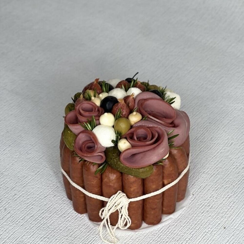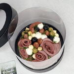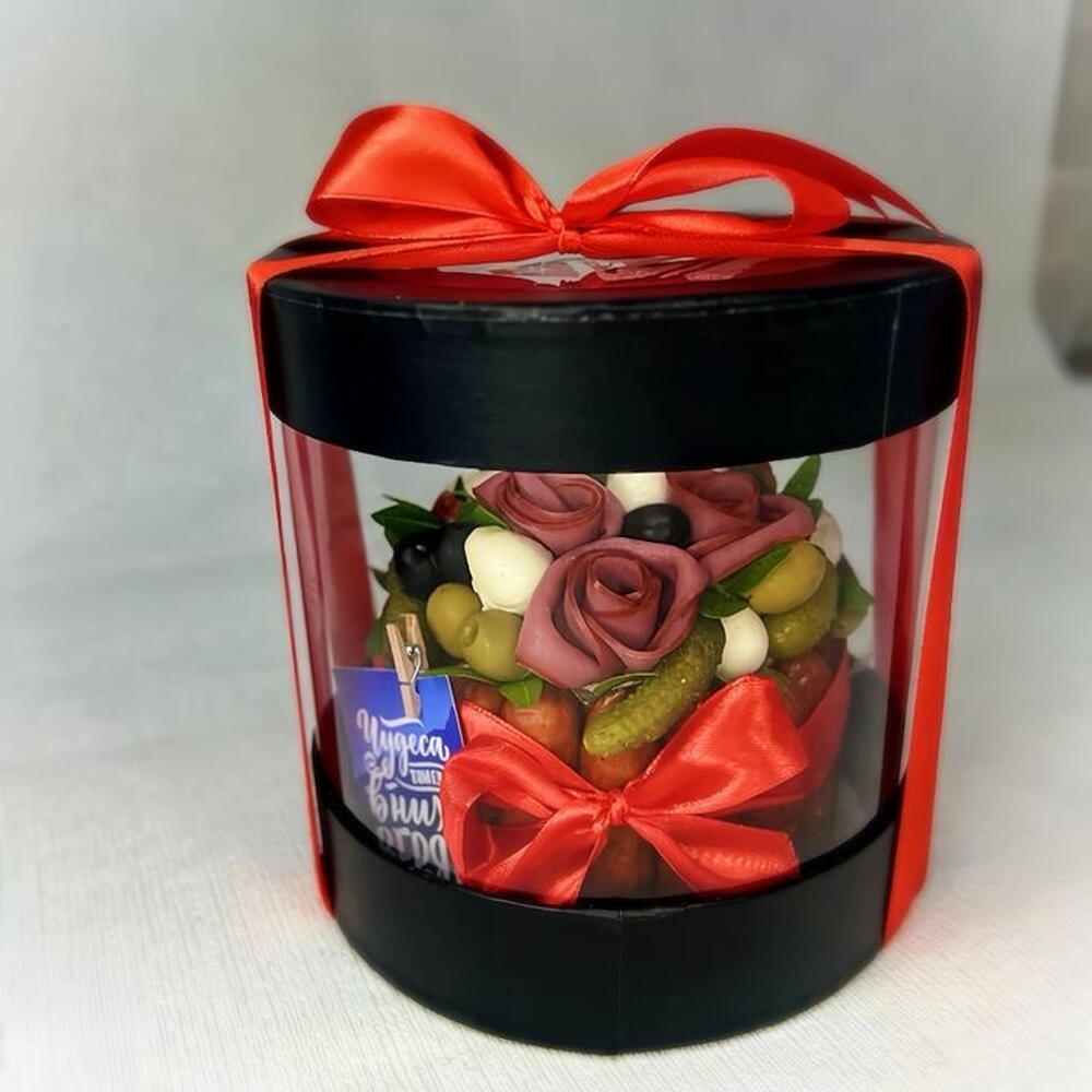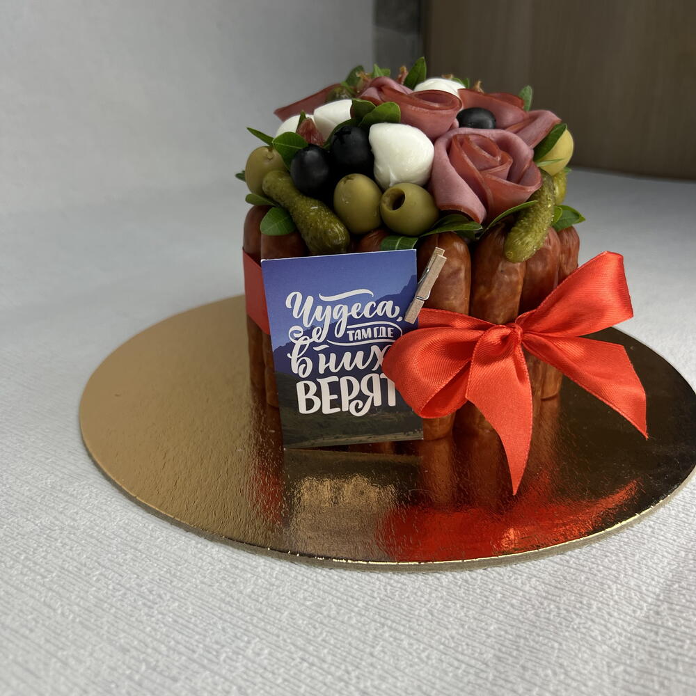 Фисташка пучок - 1 шт. маслины упаковка - 1 шт. колбаски охотничьи упаковка - 2 шт. сыр сливочный - 350 гр. открытка с вашими пожеланиями - 1 шт. оливки в банке - 1 шт. колбаски пиколини упаковка - 1 шт. говядина нарезка упаковка - 1 шт. зубочистки упаковка - 1 шт. корнишоны маринованные банка - 1 шт. моцарелла шарики упаковка - 1 шт. лента или кулинарная нить - 2 шт. подарочная коробка для торта - 1 шт.