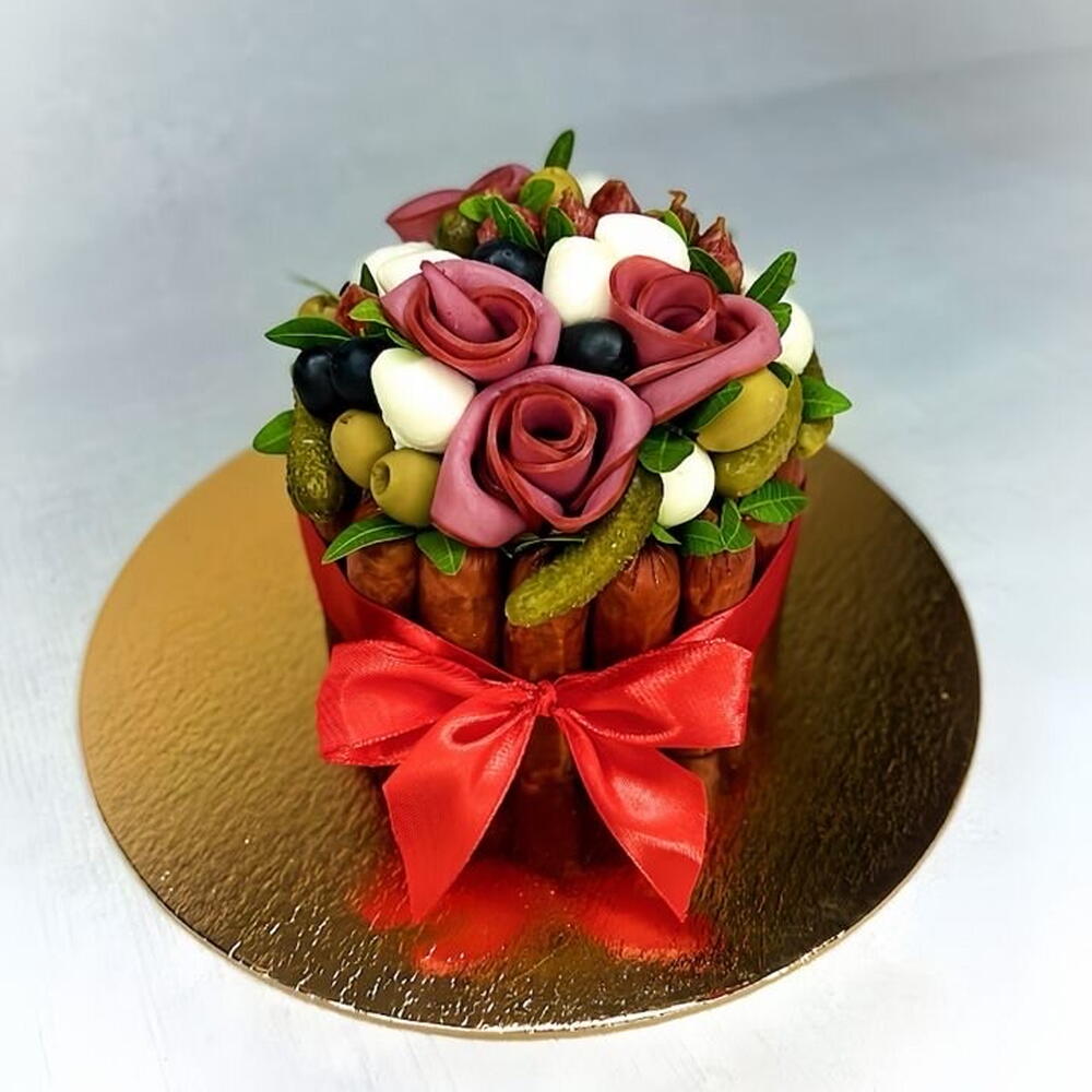 Стильный, небольшой тортик из мясных и сырных деликатесов, который придется по вкусу не только мужчинам. Мужской мясной торт наверняка оценят дамы. Попробуйте подарить его сестре, подруге или коллеге в качестве необычного подарка. Приятный сюрприз будет на день рождения, для отца, друга и мужа. А также на любой повод.