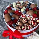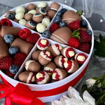 Meet our new sweet composition - a 20 cm diameter box filled with love: 9-12 bananas in milk chocolate. Chocolate-covered strawberries, 10-12 pcs. Raspberries and blueberries in white and milk chocolate. This is not just a dessert - its a small holiday in every piece!