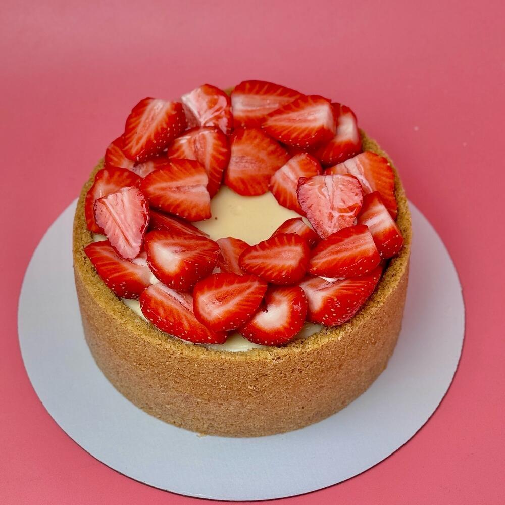 Творожный сыр, сливки 33%, миндальная мука, пшеничная мука высшего сорта, сахар, сливочное масло 82,5%, сахарная пудра, яйцо, цедра и сок лимона, натуральный ванильный экстракт, соль. Декор - клубника.