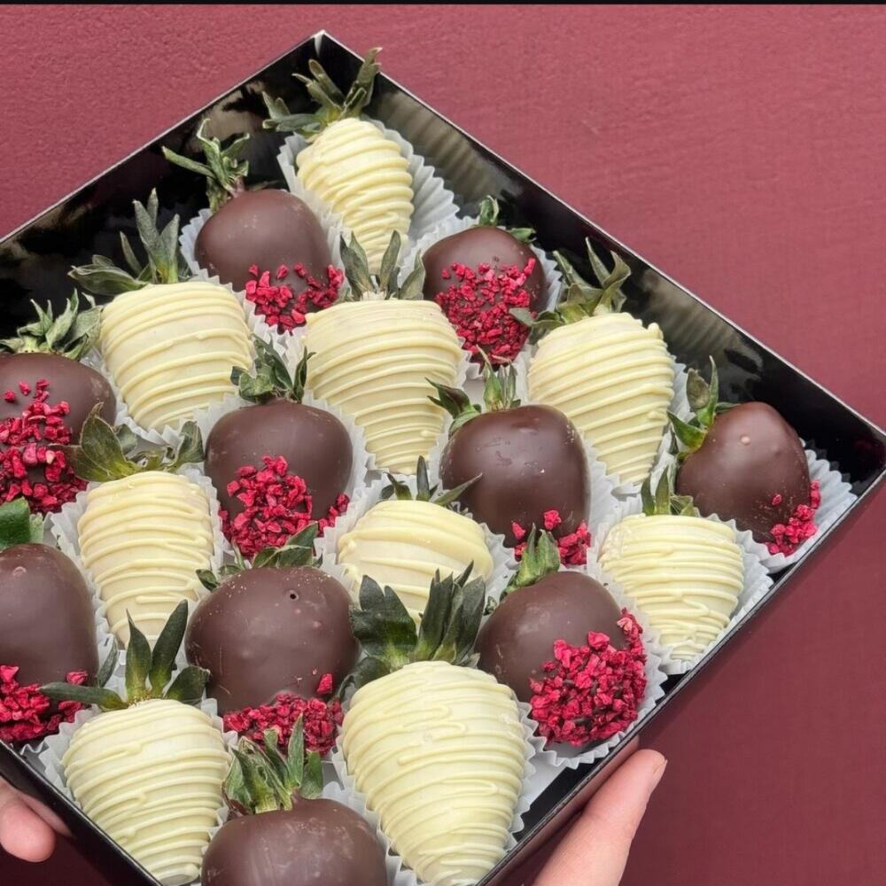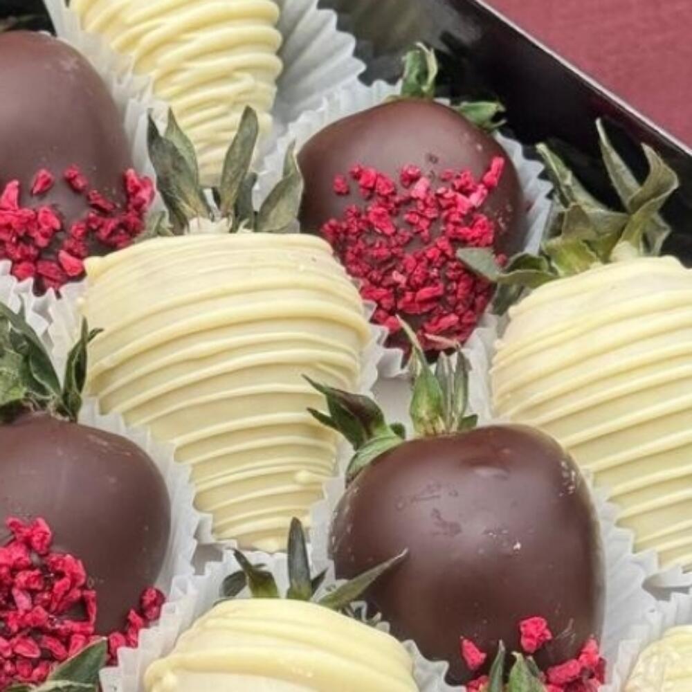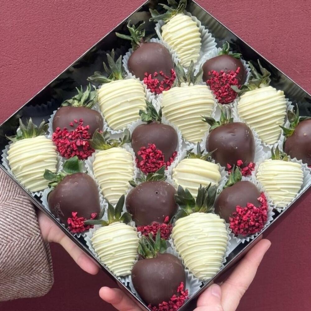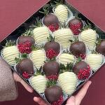 Клубника отборная Натуральный 20шт. молочный и белый шоколад Сублимированная малина. какао-масло, тертое какао, сухое цельное молоко, сахар, натуральные лецитин и ваниль.