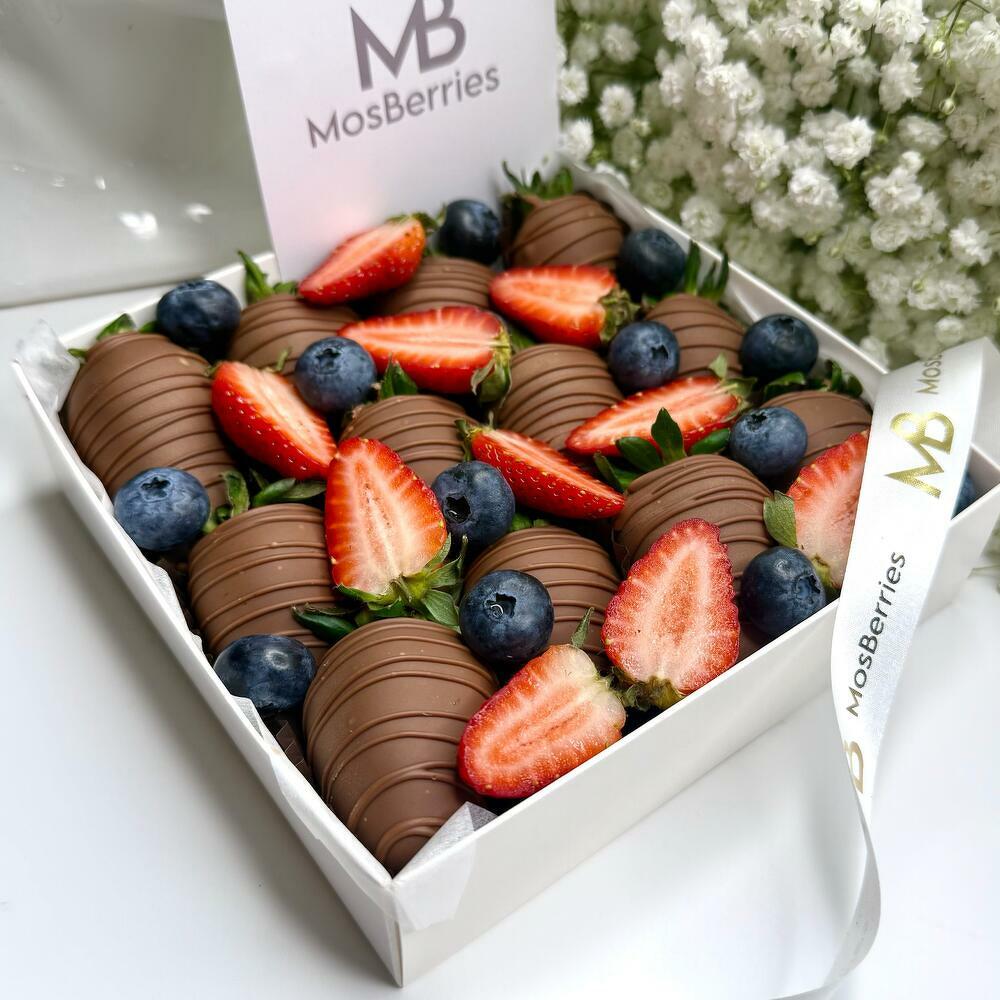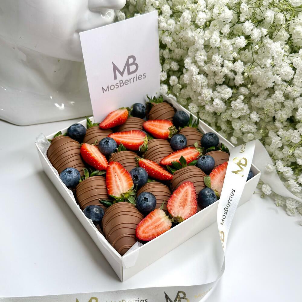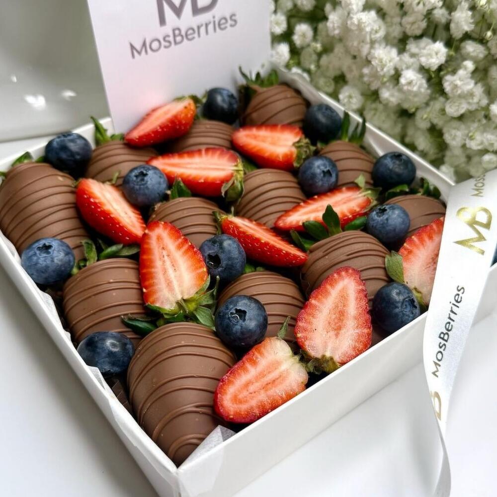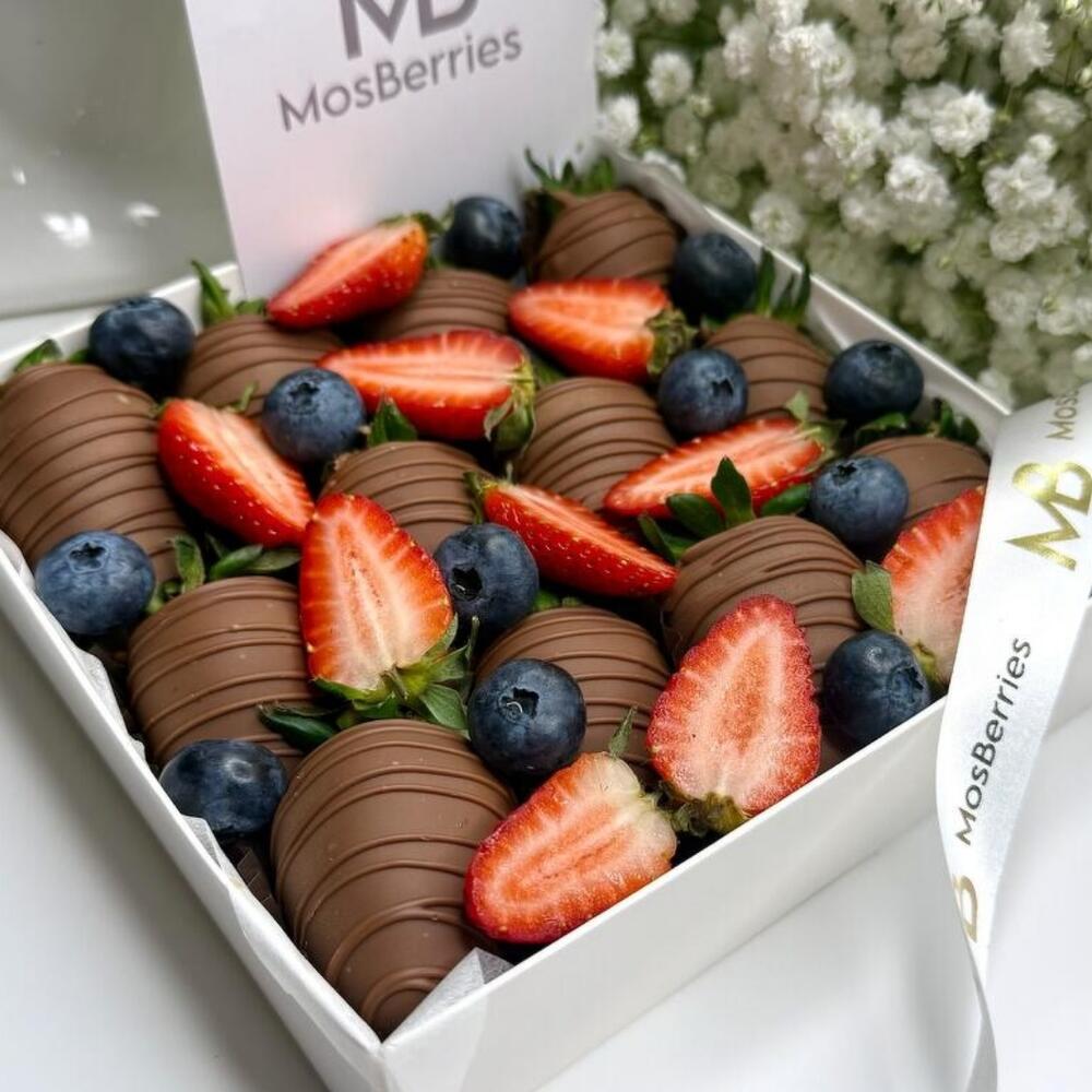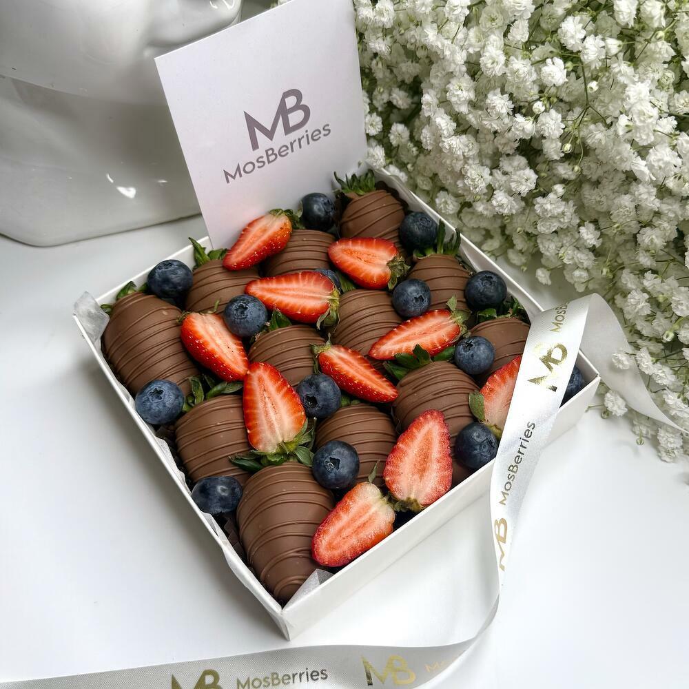 12-16 шт.? (количество зависит от размера клубники*)✨ - Свежая отборная клубника; - Шоколад молочный (сахар, масло какао, сухое цельное молоко, какао тертое, эмульгатор соевый лецитин, ароматизатор натуральный ваниль, какао); - Свежая отборная голубика.