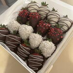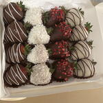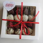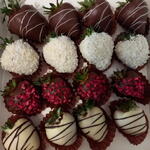 Świeże truskawki, czekolada mleczna, biała czekolada, kokos drobnoziarnisty, liofilizowane maliny