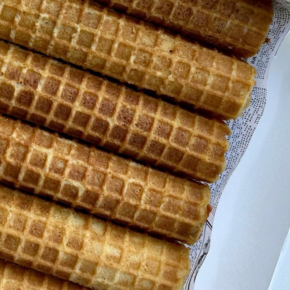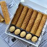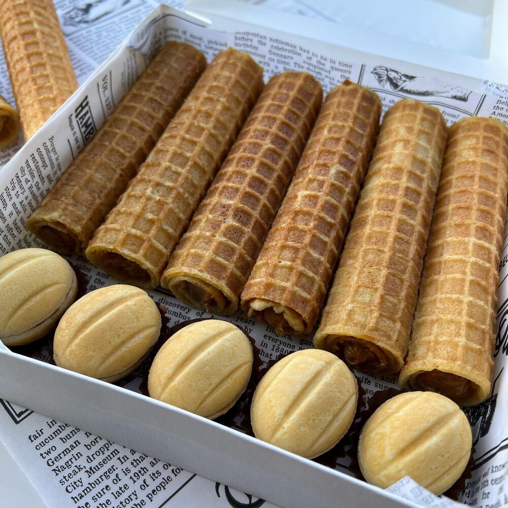 Waffle tubes with condensed milk - 6 pieces Nuts with condensed milk - 5 pcs. Ingredients: butter 82%, flour, egg, sugar, condensed milk.
