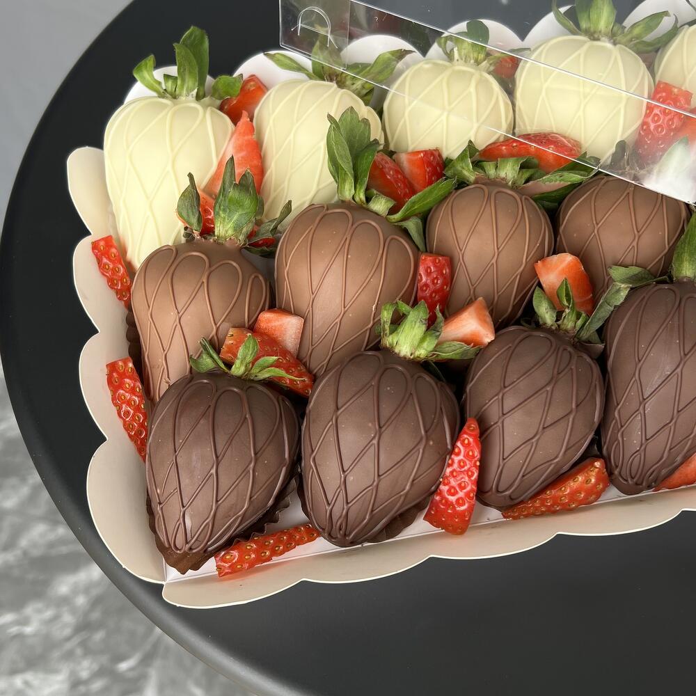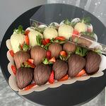 A box with strawberries in three types of chocolate: white, milk and dark. Quantity 15/18 pcs.