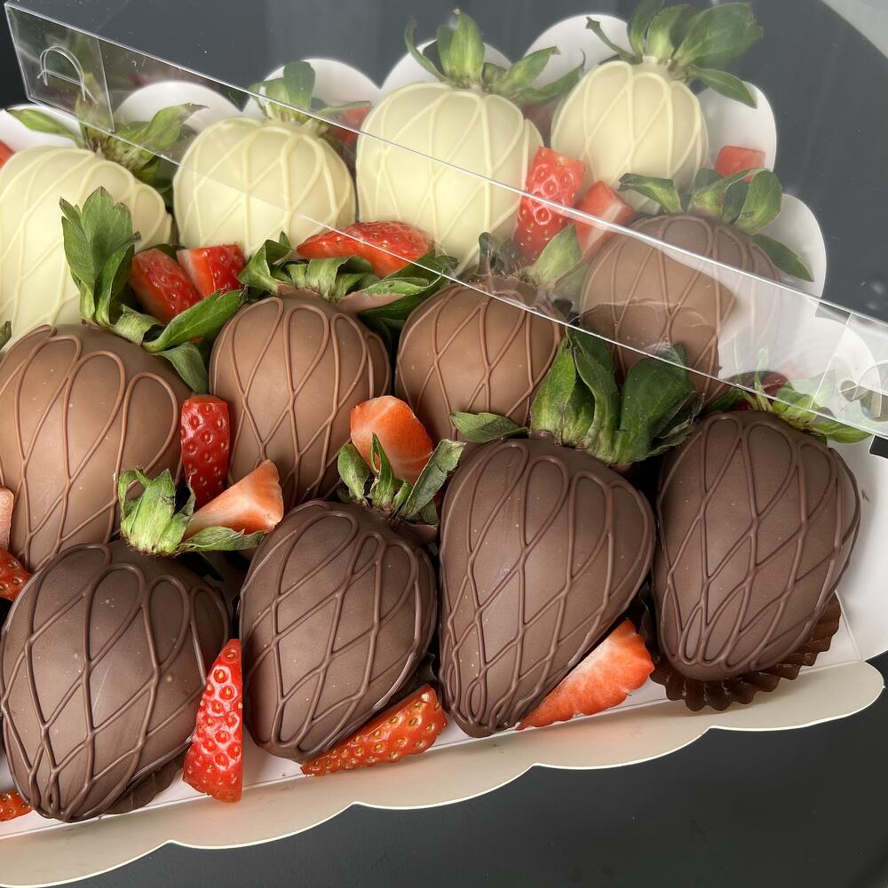 White chocolate covered strawberries 5 pieces Milk chocolate covered strawberries 5 pieces Strawberries in dark chocolate 5 pieces