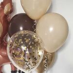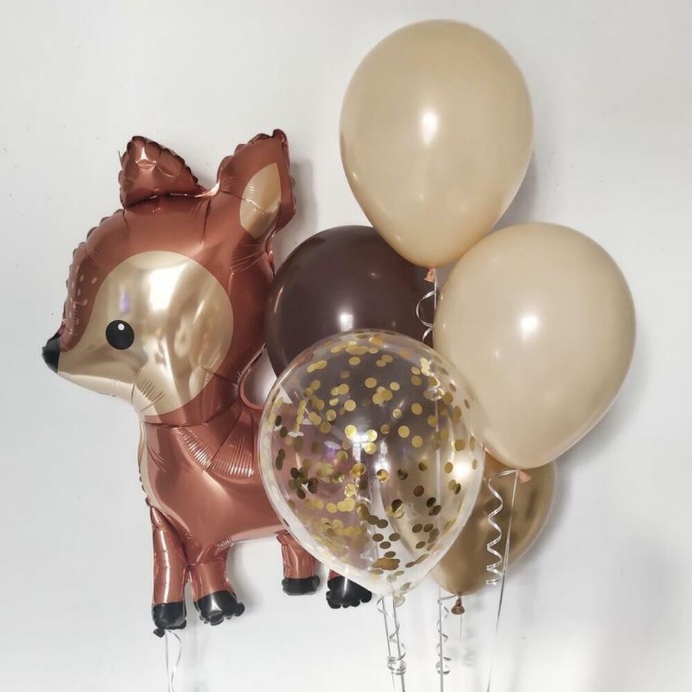 Милый сет из 5 латексных шаров и фигурного фольгированного шара в виде оленёнка. Отлично подойдёт на день рождения, как взрослому, так и ребенку вне зависимости от пола. В состав входят шары: - 1 латексный гелиевый шаро коричневого цвета 25см -1 прозрачный шарик с золотыми конфетти 30см - 1 золотой воздушный шарик Хром 30 см - 2 бежевых воздушных шарика 30 см - фольгированный шар- фигура Олененок 99см Все шары обработаны специальной жидкостью, что позволяет увеличить время полета от 3 дней. При желании можно добавить надпись на шары или дополнительные шары, например, в виде цифр или других животных.