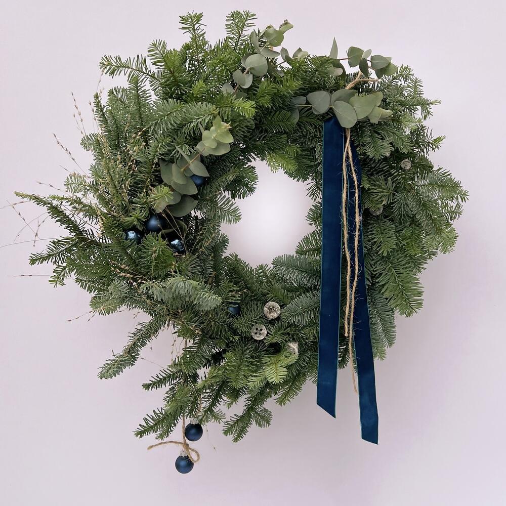 Feeling festive? Us too. Get into the Holiday spirit by shopping our special Christmas collection. It was inspired by the curved branches and unconventional materials that show the authentic and genuine beauty of the season. Discover our full range of wreaths, centrepieces and festive accessories that will give your celebrations some extra sparkle. Whether dressing your home for a Christmas party, or celebrating the season's more understated moments, enjoy this elegant wreath with a splash of noble blue. The naval-blue velvet ribbon matches perfectly with miniature Christmas balls and splendid greens and will indulge the most refined eyes. Our wraths are sustainably sourced and designed to last 1.5-2 months without any special treatment. However we recommend spritzing your wraths with water to refresh every few days to keep them lasting throughout the festive period. Each wreath comes with an easy-to-set hanger so it is ready to hang on your front door or in your home. The hanger can be easily taken off without stains on any surface. Чувствуете приближающиеся праздники? Мы да! Подарите себе Рождественское настроение с нашей праздничной коллекцией. Мы вдохновлялись естественностью и натуральностью, использовали изогнутые ветки и нестандартные материалы. Представляем наши венки, композиции и праздничный аксессуары, которые точно украсят ваш праздник. Готовитесь ли вы принимать гостей, или настроены на более уединенный лад в этом праздничном сезоне, порадуйте себя этим элегантным венком с капелькой благородного синего. Бархатная лента глубокого синего цвета прекрасно сочетается с небольшими новогодними шарами и роскошной зеленью, и точно порадует самого взыскательного гостя. Все наши венки собираются вручную и с заботой и не требуют специального ухода. Венки будут радовать вас 1.5-2 месяца. Мы рекомендуем только иногда слегка сбрызгивать их водой для большей свежести. К каждому венку мы прикладываем крючок, который крепится к любым поверхностям и также бесследно снимается.
