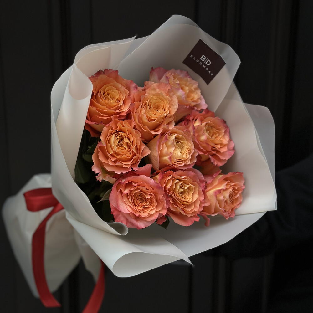 Bukiet z 9 pomarańczowych róż - (50-60cm) Zamów stylowy bukiet z czerwonymi różami. W skład bukietu wchodzą rozy najwyższej jakości sprowadzone z Kolumbii/Ekwadoru