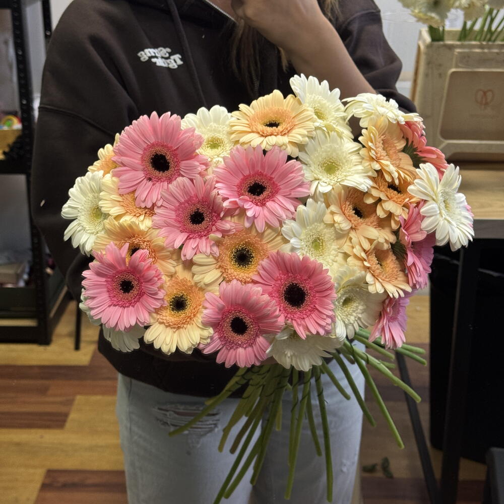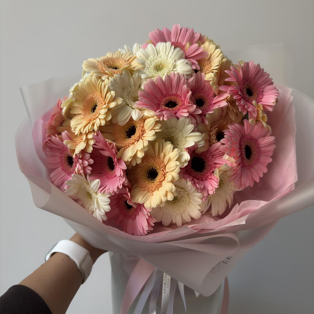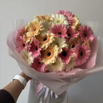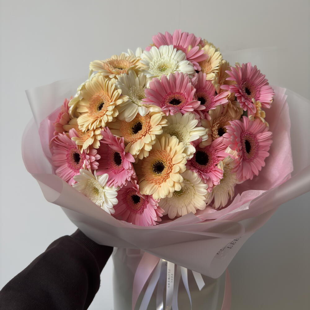 Uroczy monobukiet, składający się z 30 mini-gerber, przypominających małe słońca, będzie idealnym dopełnieniem i poprawi nastrój na cały dzień. Bukiet ten z pewnością ucieszy miłośnika błyszczących punktów w dotyku i pozostawi ciepłe wrażenie, nadając naturze barwnego i niepowtarzalnego oblicza.
