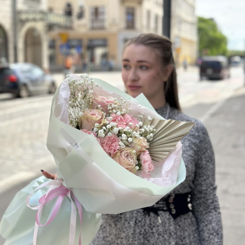 dianthus - 5 ədəd gipsofila - 3 ədəd çiçəkçi kağızından qablaşdırma - 1 ədəd çəhrayı gül - 4 ədəd dodatki sztuczne - 1 ədəd
