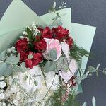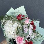 Eucalyptus - 3 ədəd Yaşıllıq - 2 ədəd Hydrangea - 1 ədəd Xrizantema - 1 ədəd Alstroemeria - 3 ədəd Gipsofila - 2 ədəd kağız - 3 ədəd qızılgüllər - 3 ədəd