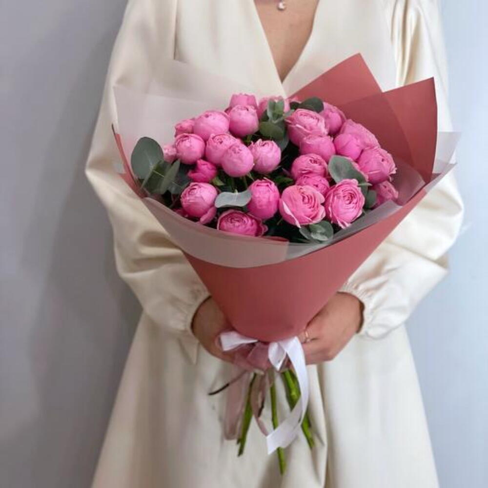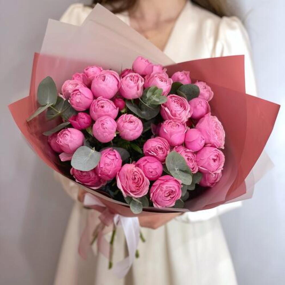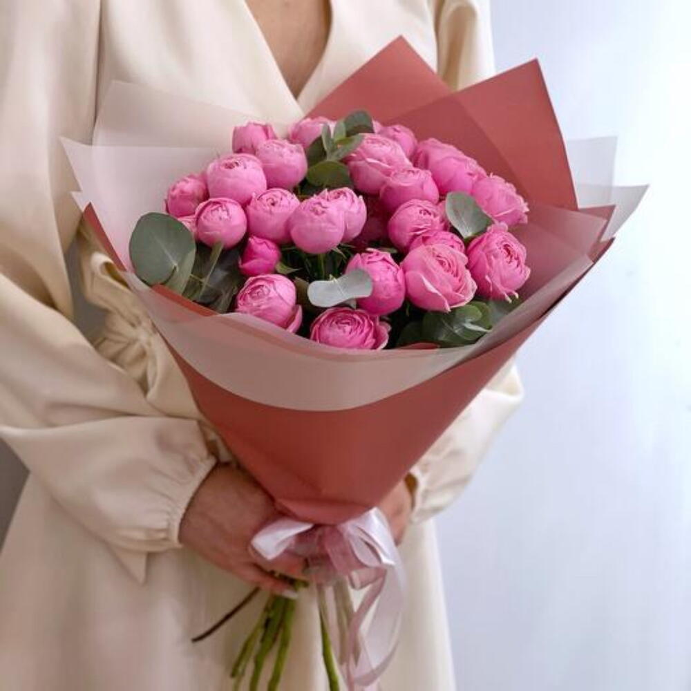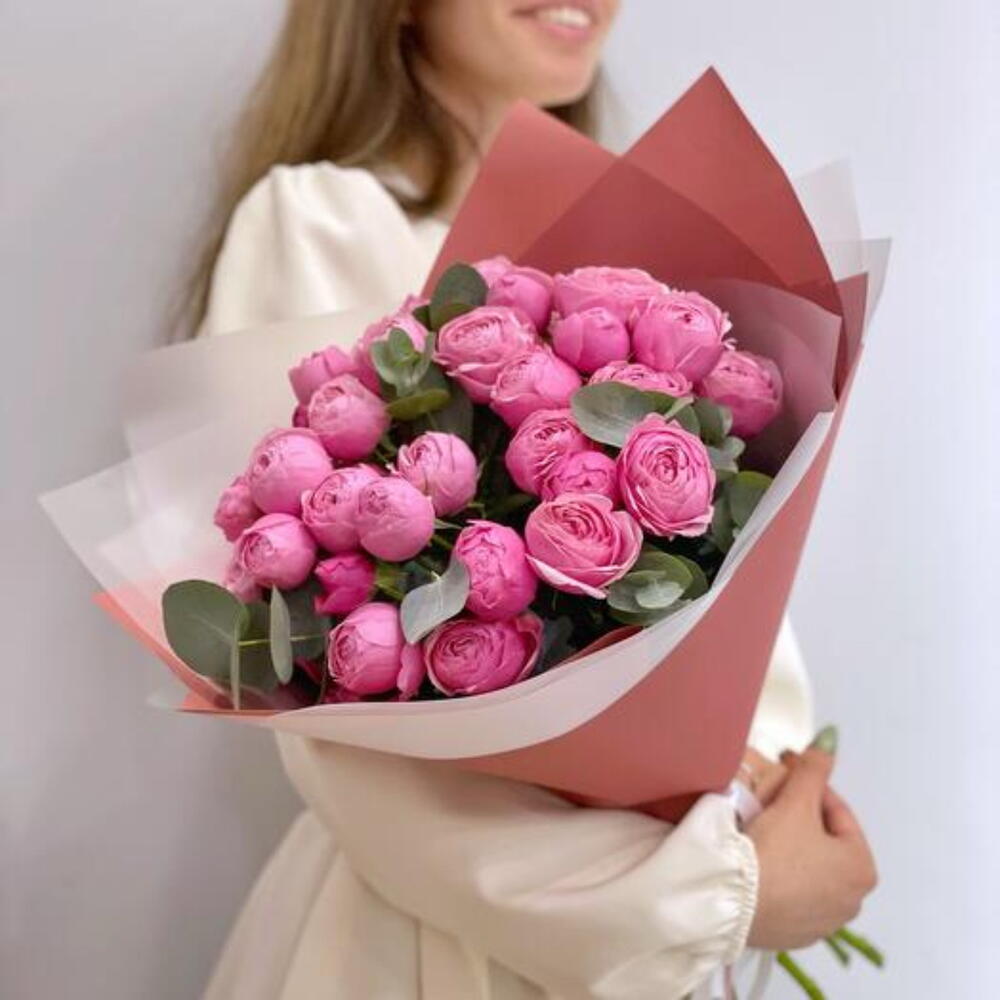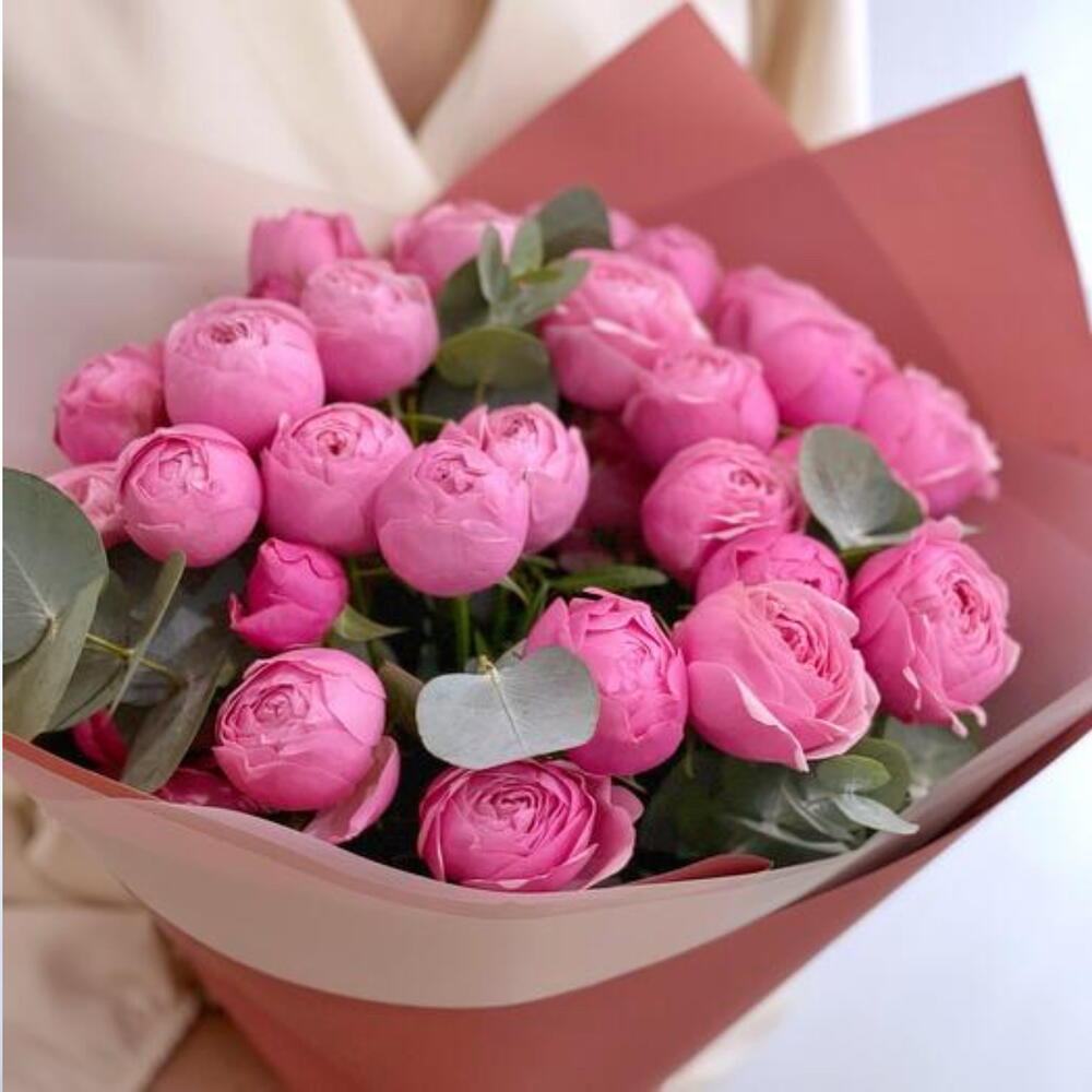 Кустовые пионовидные розы Сильва Пинк с эвкалиптом