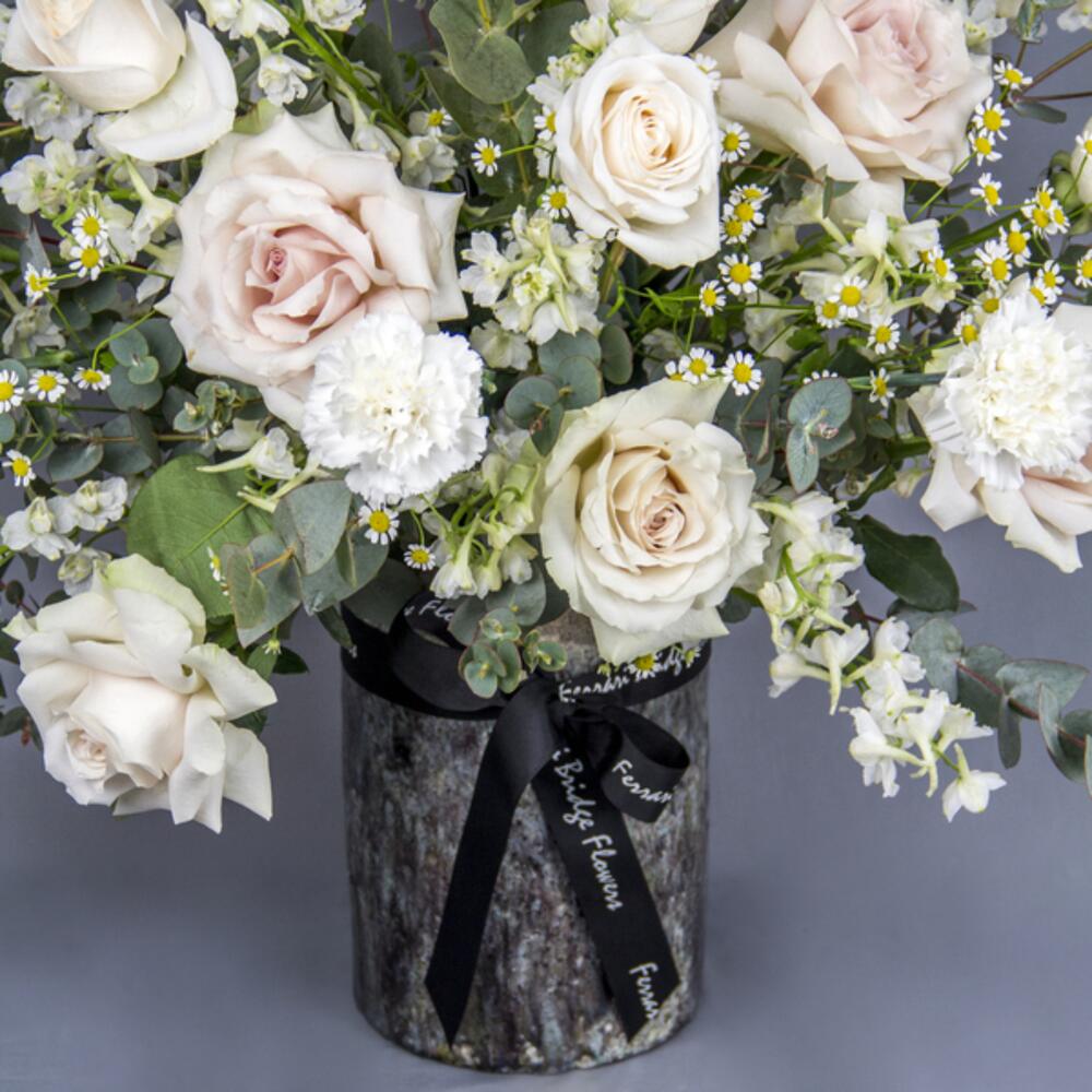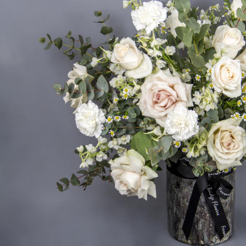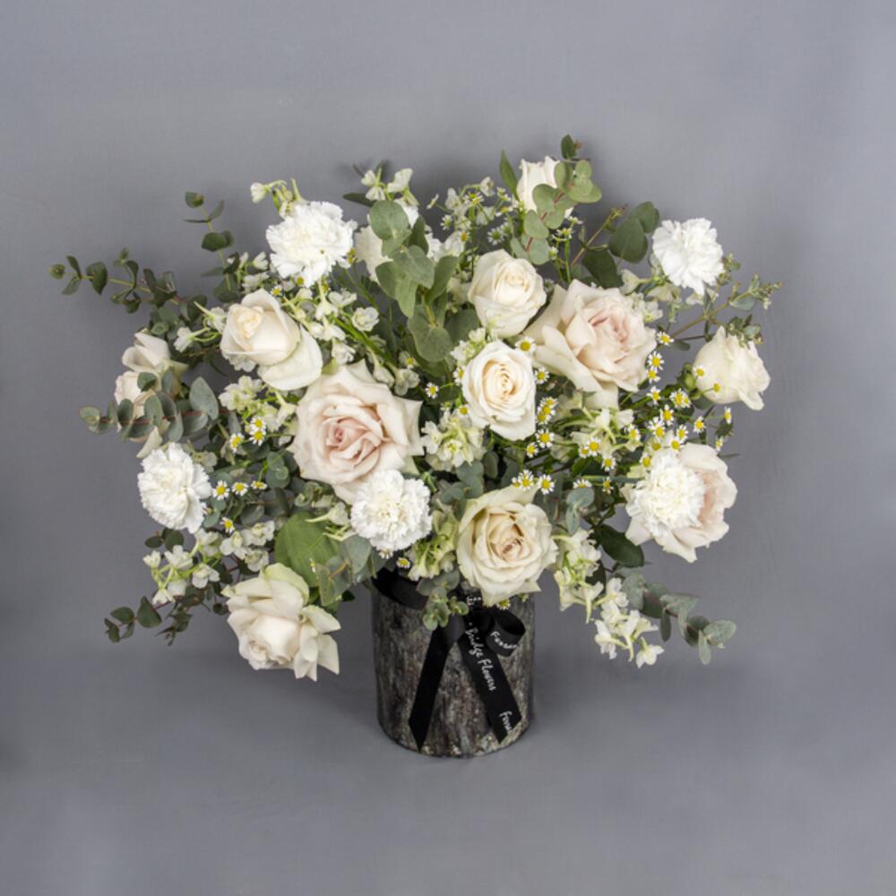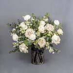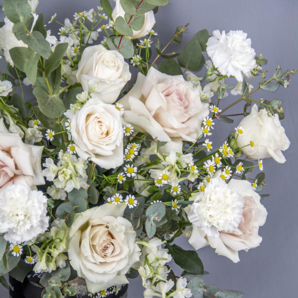 A vase arrangement of white roses, quicksand roses, white carnation, Daisy and eucalyptus leaves