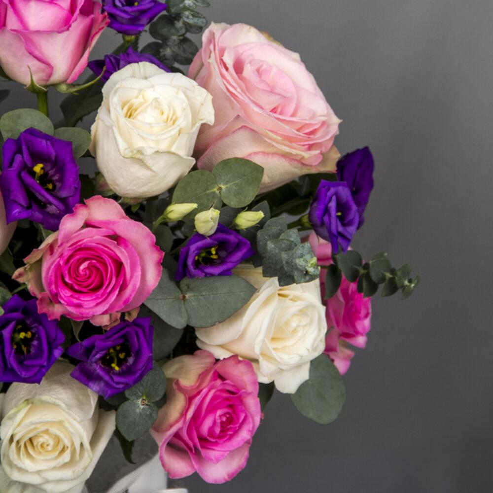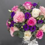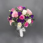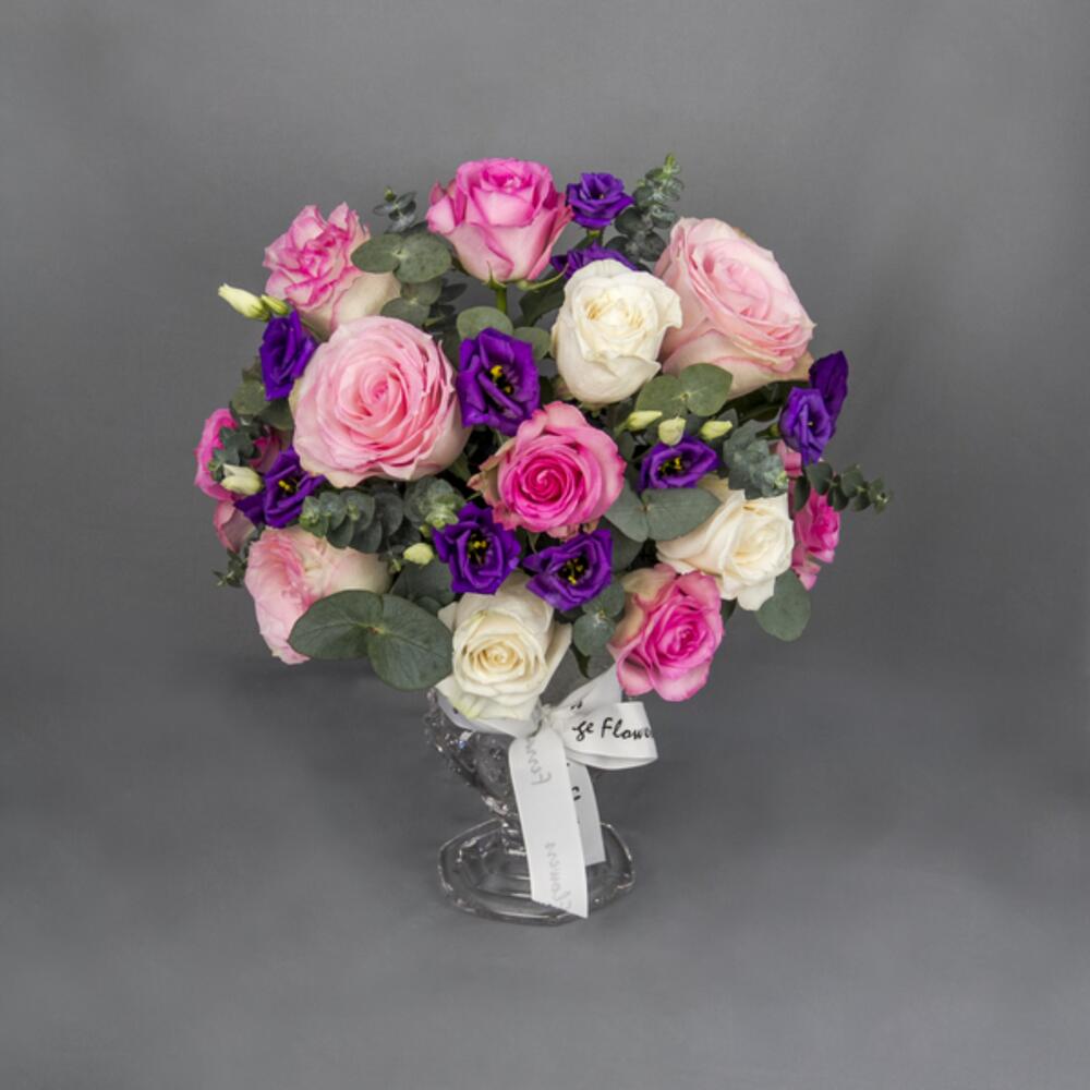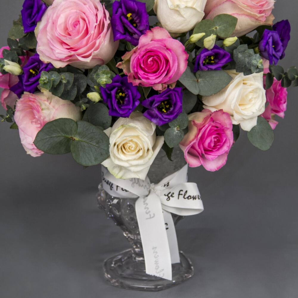 A beautiful vase arrangement with mix color of Roses, purple Eustoma and Eucalyptus leaves in a classic glass vase.