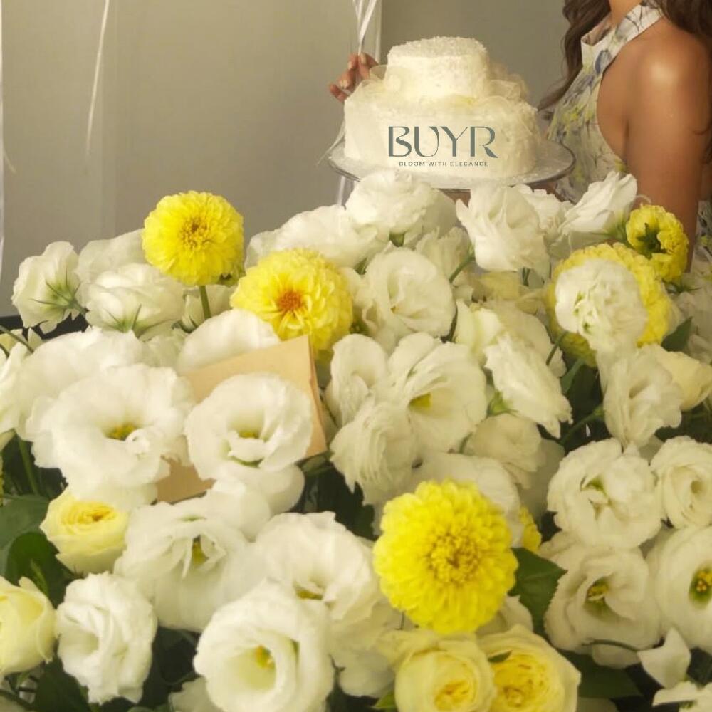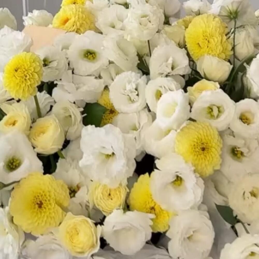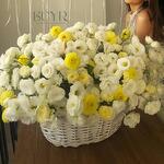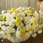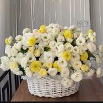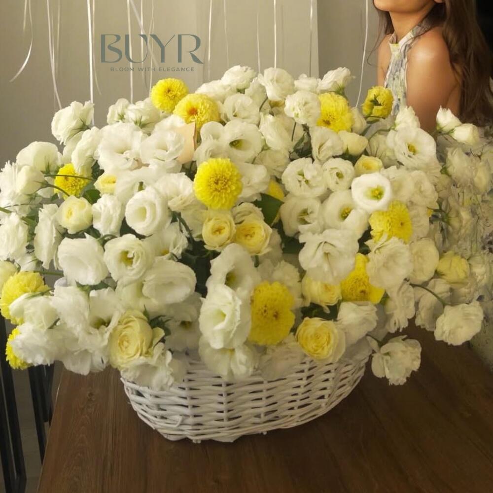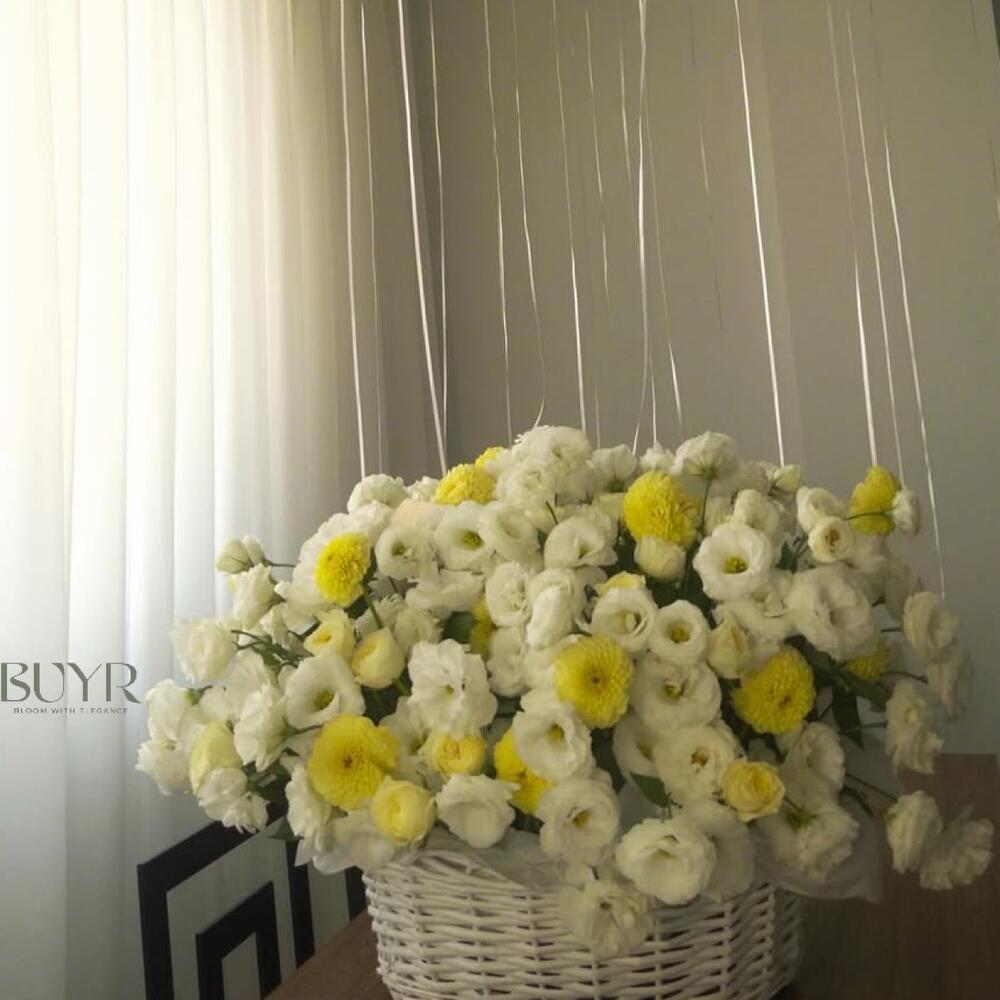 Роскошная композиция в бело-жёлтых оттенках, собранная в большой плетёной корзине. Нежная белая эустома, кремовые розы и яркие жёлтые георгины создают ощущение тепла, уюта и праздничности. Такой букет станет идеальным подарком для дня рождения, юбилея или просто чтобы осветить день любимого человека. 💛 Состав может меняться в зависимости от сезона, но мы всегда сохраняем настроение и цветовую гамму композиции.