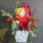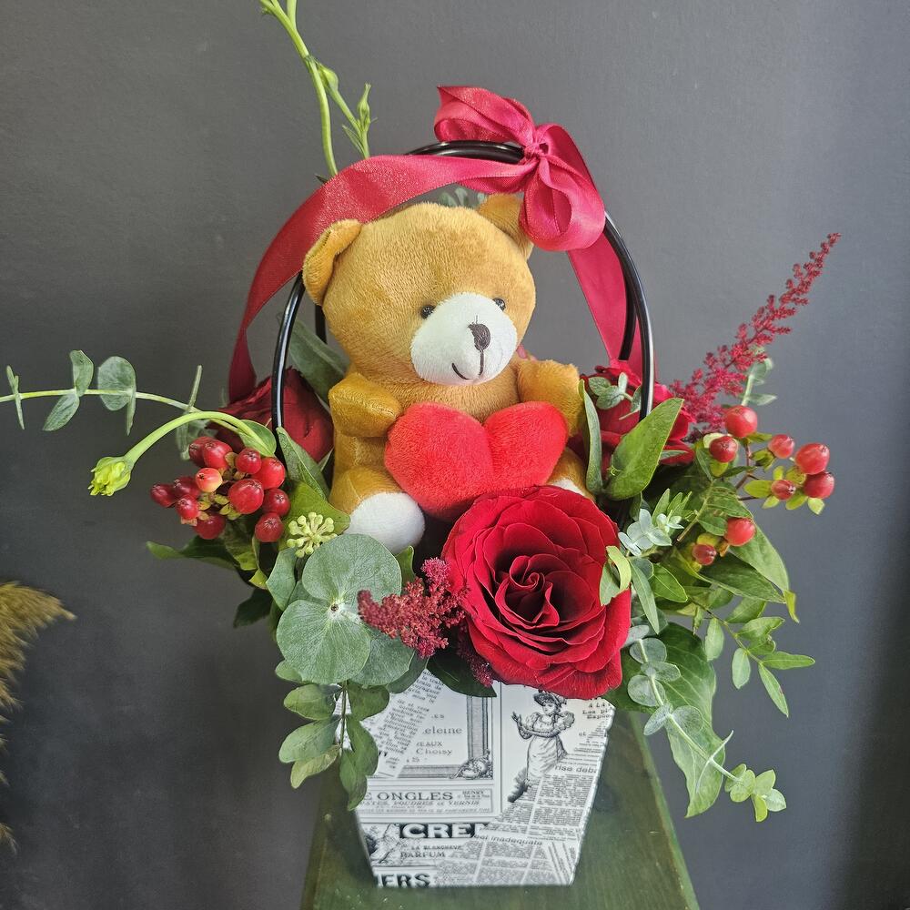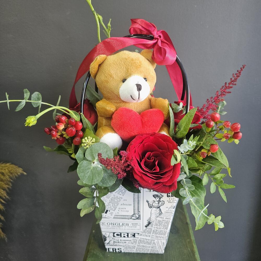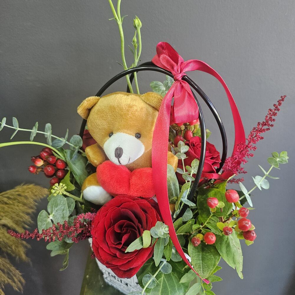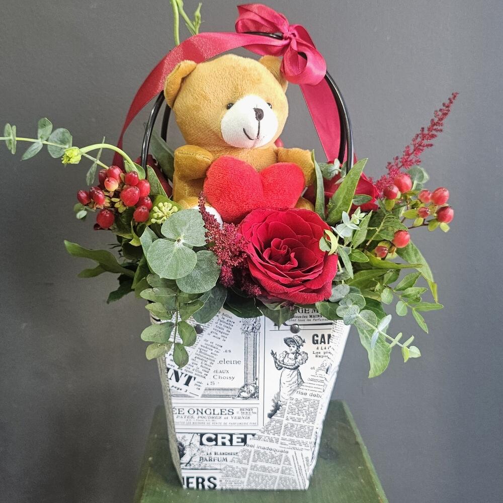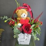 Yaşıllıq - 5 ədəd hippericum - 2 ədəd eucalyptus leaves - 5 ədəd teddy bear 20cm - 1 ədəd red roses - 3 ədəd