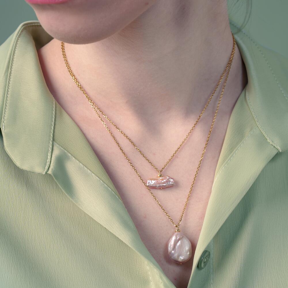 Минималистичное двойное ожерелье из тонких цепочек с подвесками из натурального речного жемчуга Кеши и Бива в нежно-розовых тонах. Оттенок жемчуга - природный розовый. Длина верхней цепочки - 40см, длина второй цепочки - 45 см. Цепочка удлинитель - 4см. Размеры жемчуга от 2 до 4 см.