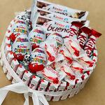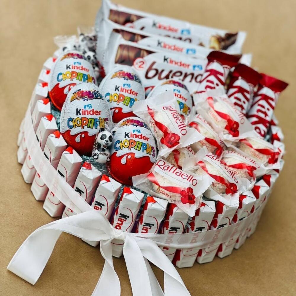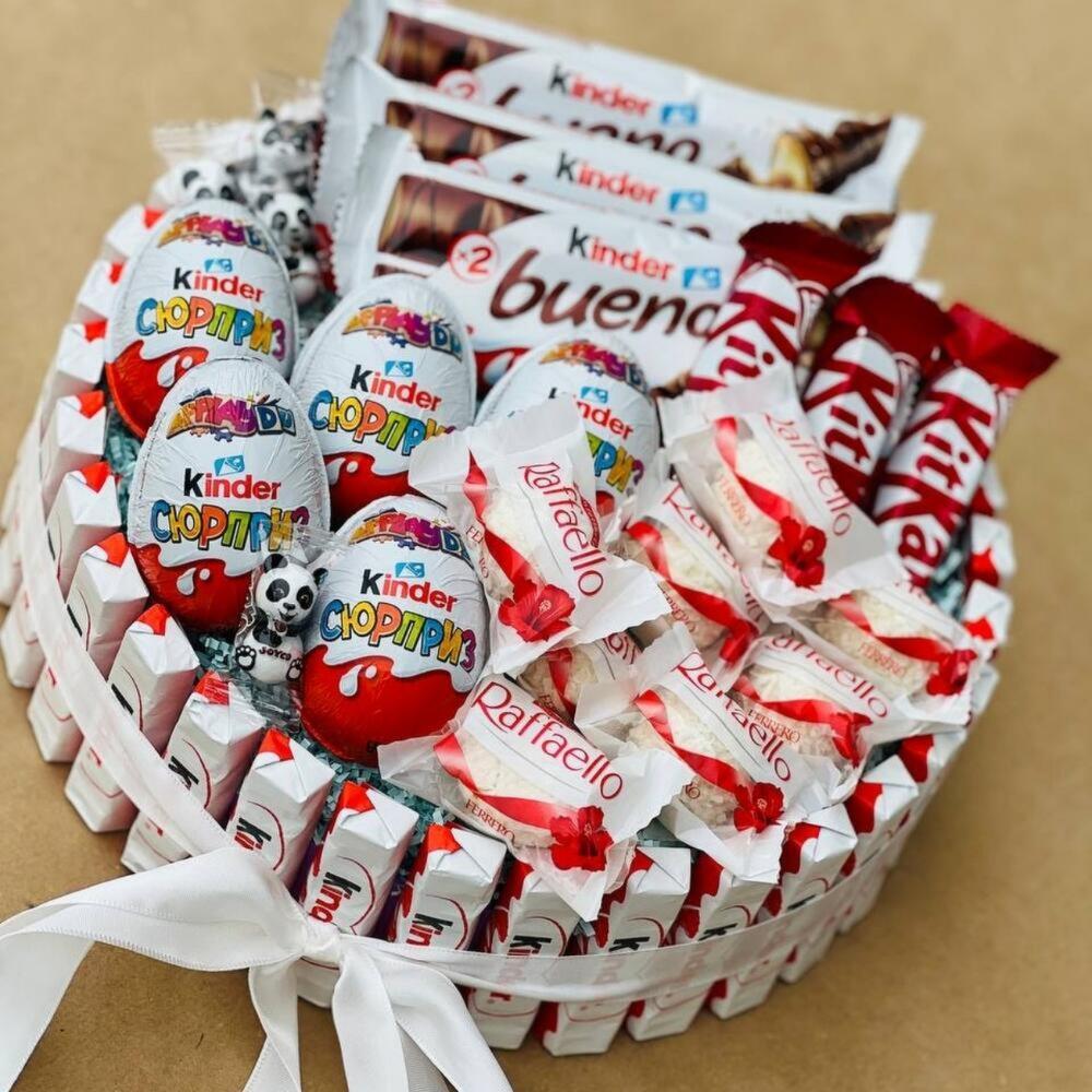 Лента атласная - 1 шт. Конфеты Raffaello - 8 шт. Киндер сюрприз - 5 шт. Киндер шоколад - 35 шт. Киндер Буэно - 3 шт. кит кат шоколад - 3 шт. конфеты панда драже - 4 шт.
