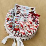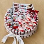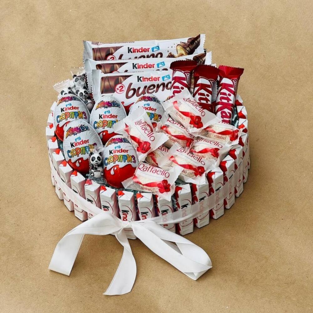 Коробка круглая - 1 ədəd Kinder bueno - 3 ədəd Kinder сюрприз - 5 ədəd Kinder chocolate - 35 ədəd Raffaello - 8 ədəd Kit kat - 3 ədəd конфет панда драже - 3 ədəd