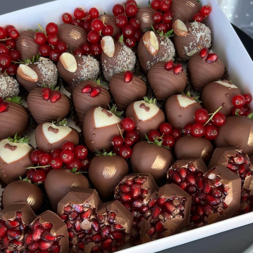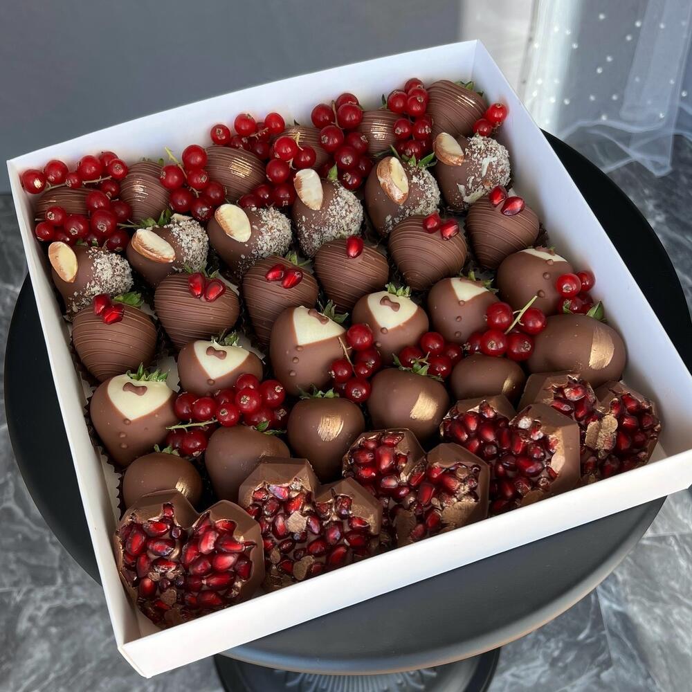 Chocolate covered strawberries: 30 pcs Chocolate covered pomegranate: 5 big hearts Red currants are a seasonal berry! Can be replaced with raspberries or blueberries!