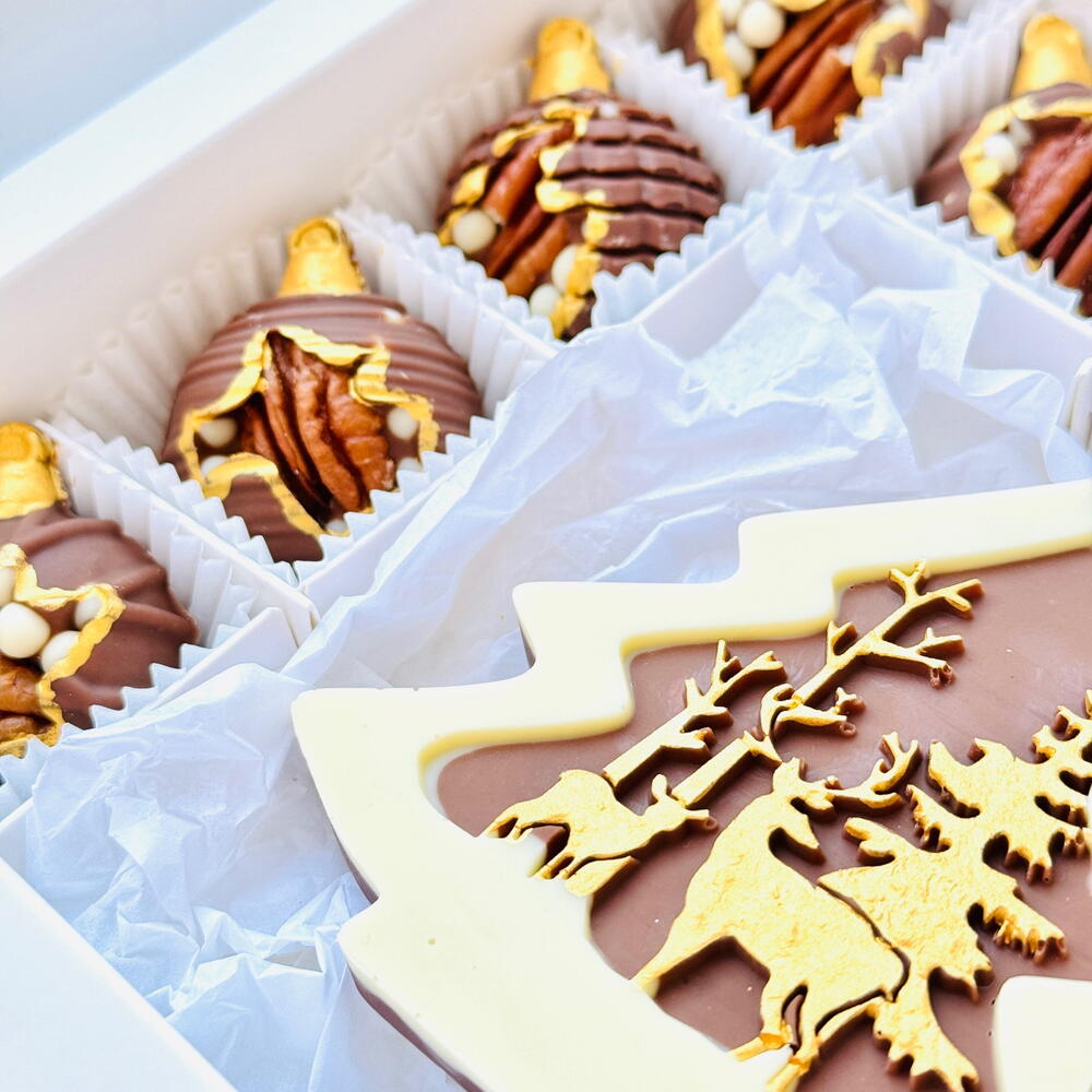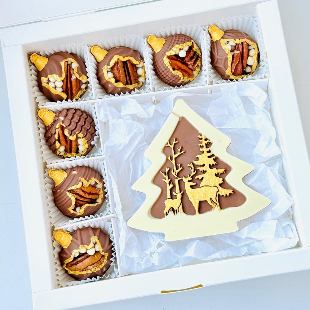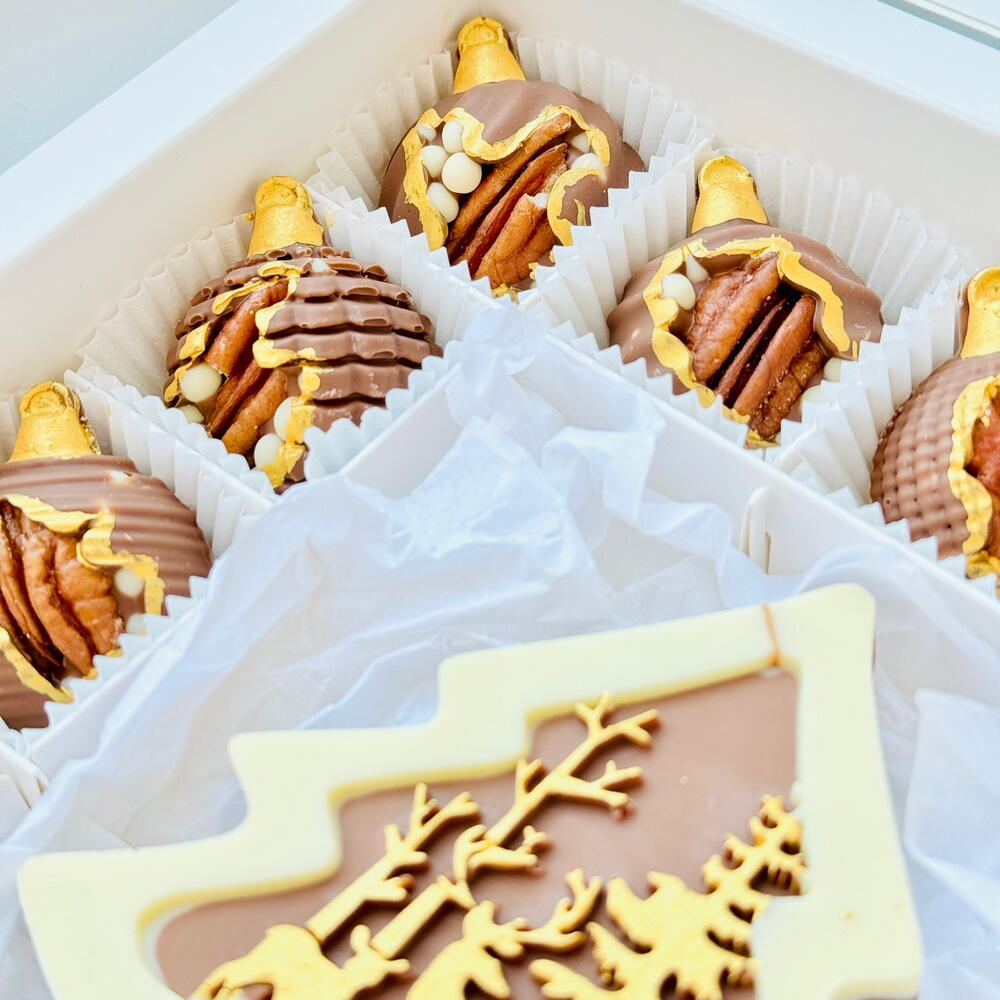 Chocolate ao leite 150 Chocolate branco 24 g Nozes pecã 15g Bolinhas de arroz 10 g Corante 1 g