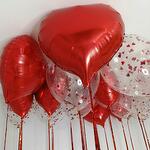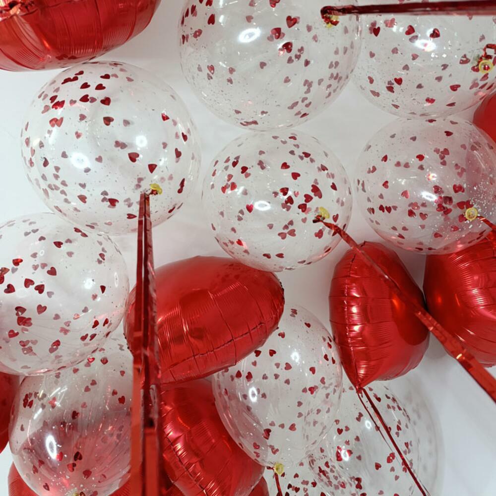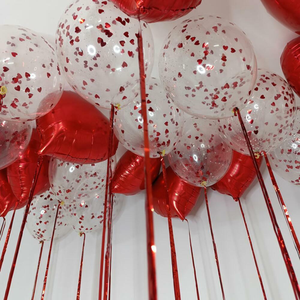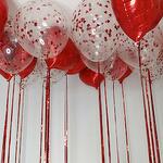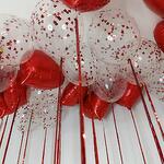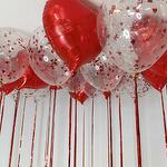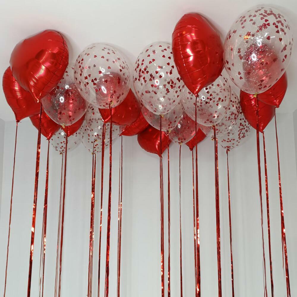 Набор из 23 шаров, в его состав входит: - 11 фольгированных шаров сердец; - 12 шаров с наполнением конфетти; - Эффектная металлизированная лента дождик.