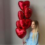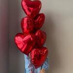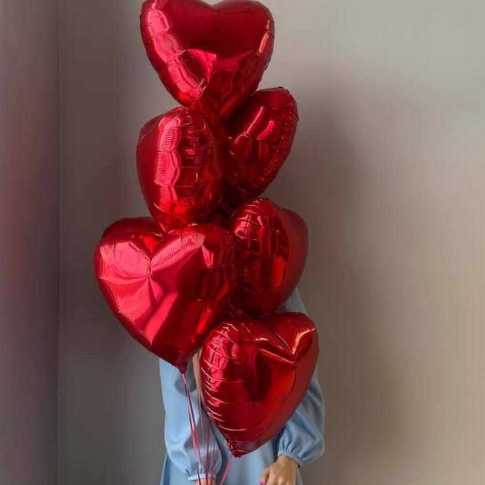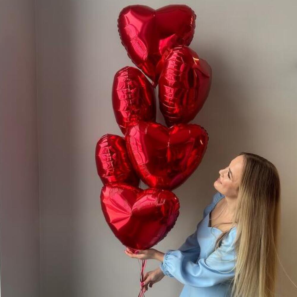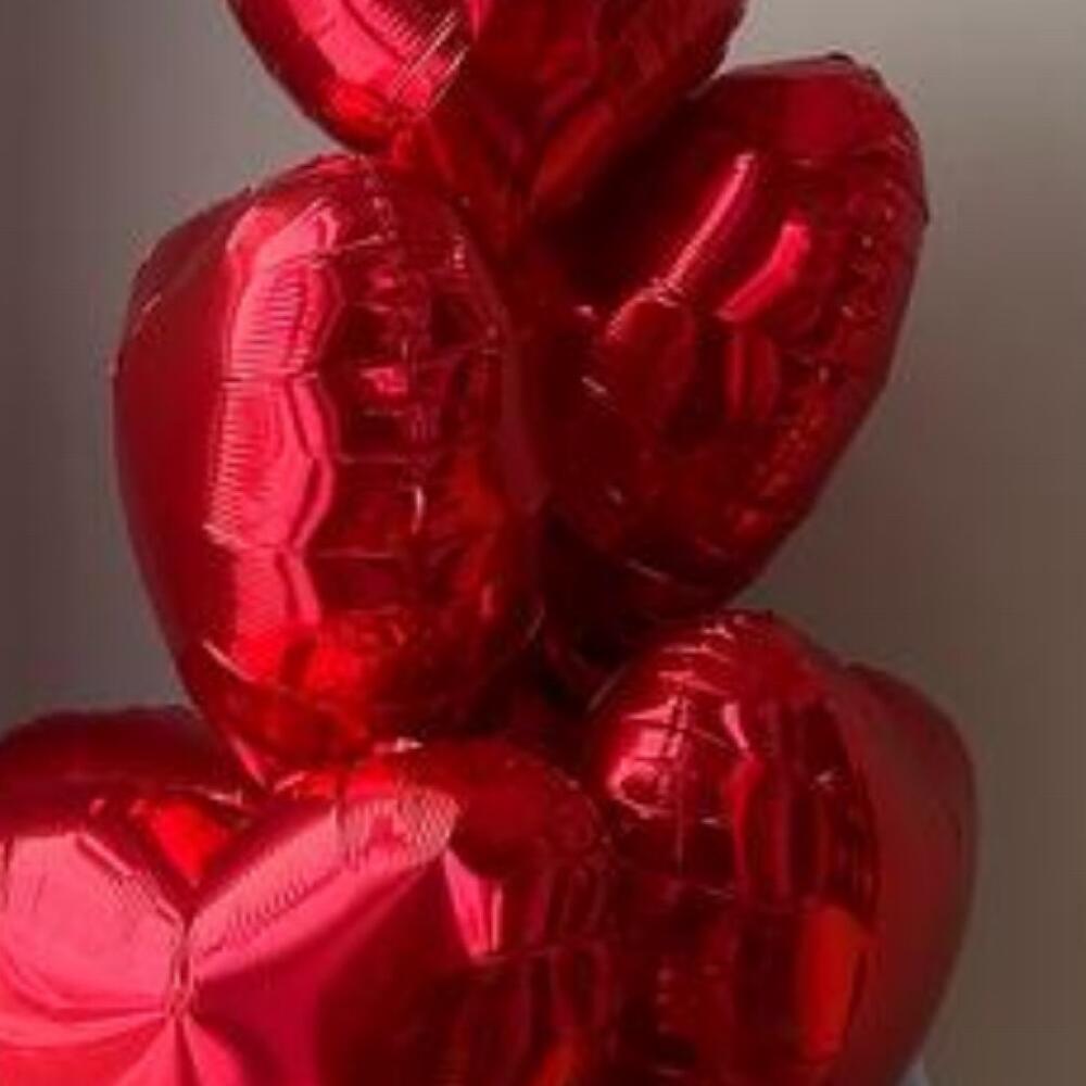 Фонтан из 7 красных фольгированных сердец стандартного размера как на фото на грузике. Отлично украсят и создадут атмосферу романтика и любви Шарики упаковываем в специальный пакет для транспортировки.
