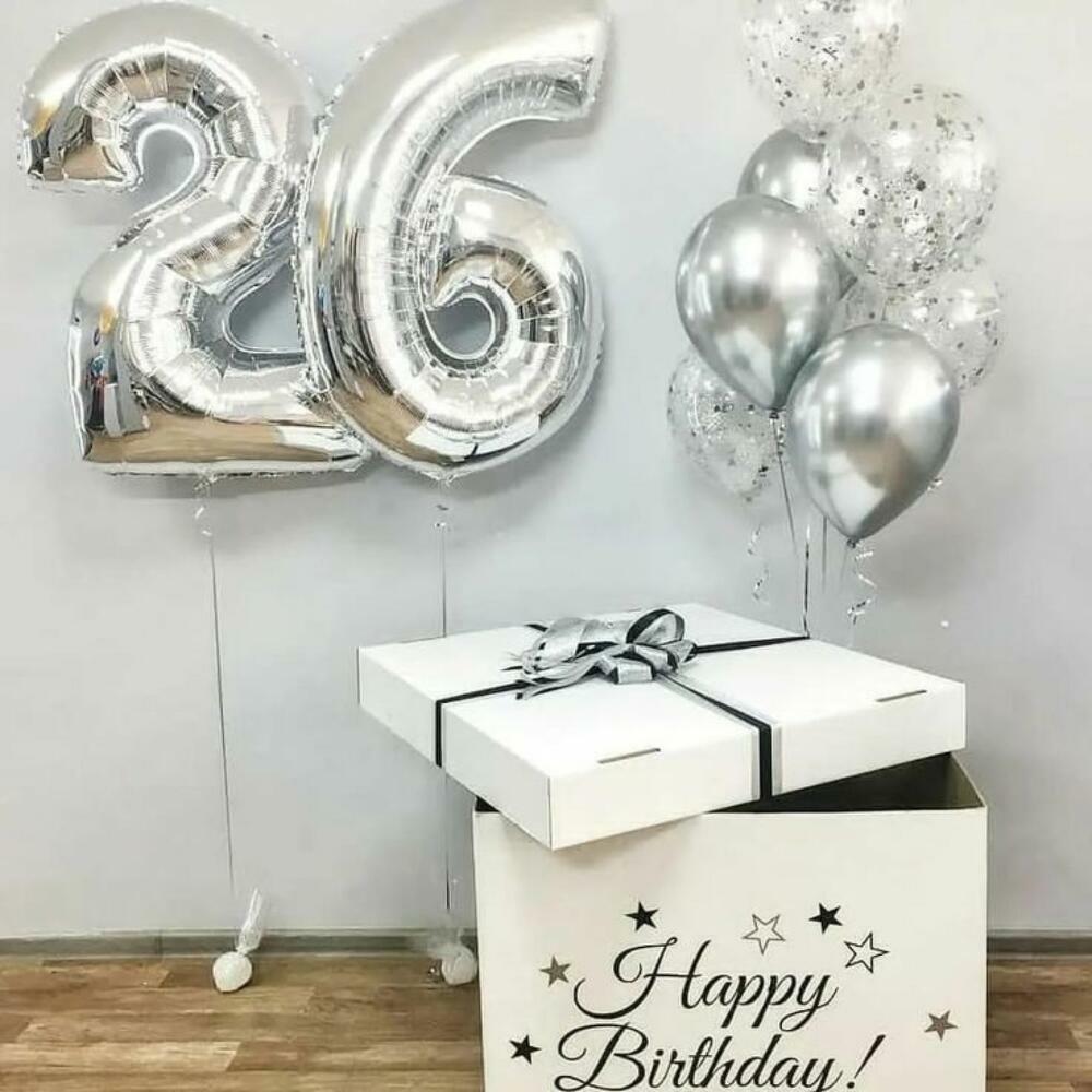 Уникальный подарок в виде коробки -сюрприза с вылетающими шариками и двумя метровыми цифрами. В состав композиции входят следующие шары: - коробка 60*60 с бантом - 3 латексных шара серебро Хром - 4 латексных шара с конфетти - 2 фольгированных цифры (могут быть любыми). По вашему желанию и при условии наличия цветовая гамма может быть изменена. Все шары надуты гелием. Все шары обработаны специальной жидкостью что позволяет увеличить время полета от 3 дней и больше. Подарок идеально подойдёт на день рождения, как мужчине, так и женщине, а также эта новинка очень удивит и порадует именинника.