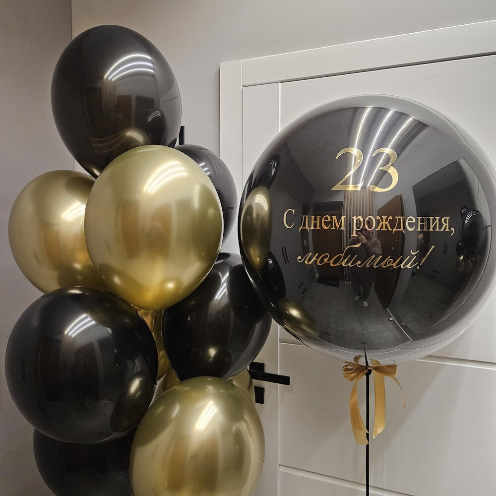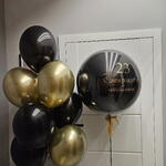 Zestaw zawiera l: 1 duzy podwojny balon z własnym napisem 5 czarnych 5 złotych baloników