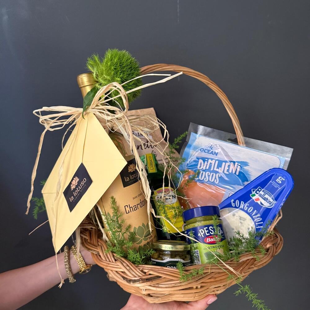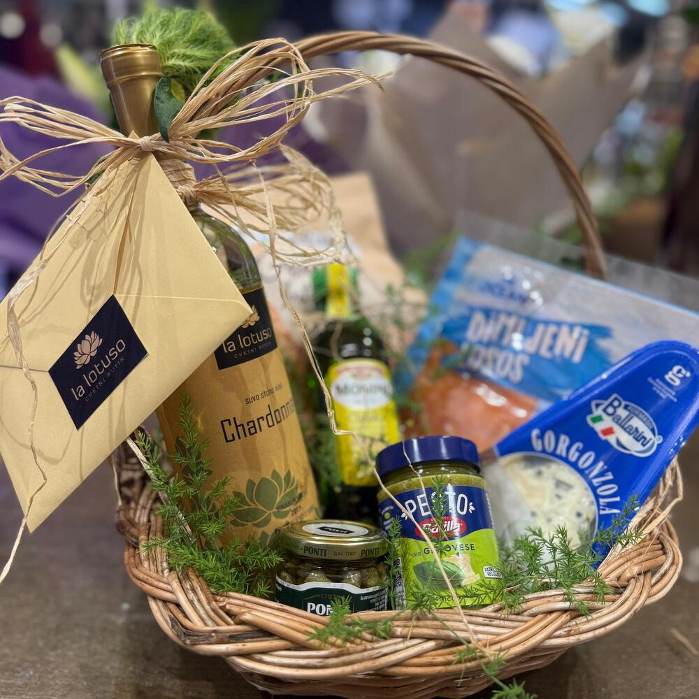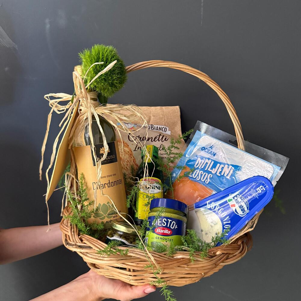 - Florist wine of choice: Chardonnay, Merlot or Merlot Rose - Capers 95gr - Monini olive oil 250ml - Pesto Genovese 135gr - Ballarini Gorgonzola cheese 100g - Salmon slices 100gr - Integral oven 1 pc 280g - Decorative wicker basket - Greenery - Raffia or decorative bow at the customers request Note: The arrangement is subject to change by the manufacturer depending on the current availability of the item. - At the customers request, fresh or potted flowers can be added, and the price is subject to change